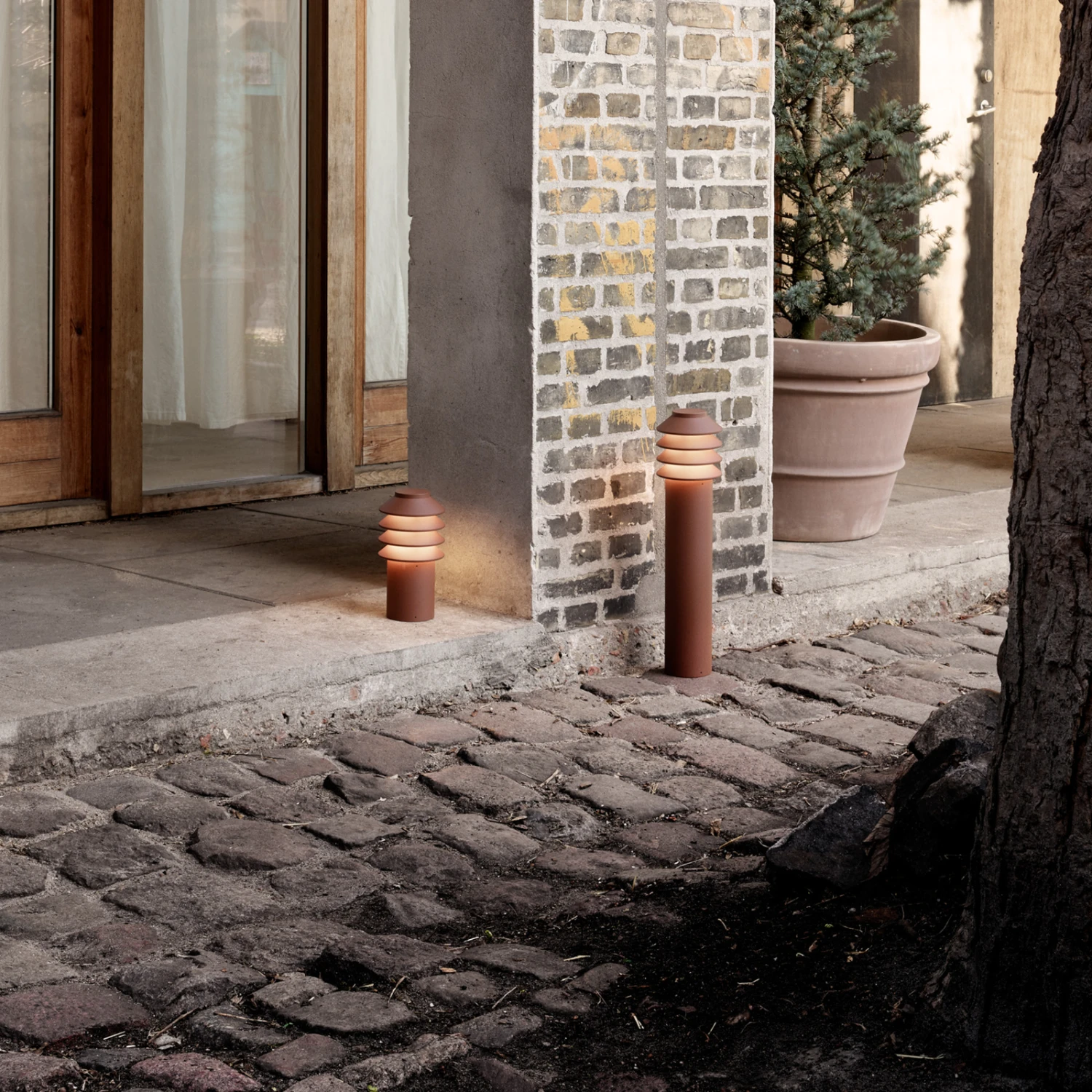 Die LED-Sockelleuchte Bysted Garden im Farbton Corten sorgt für eine sichere Ausleuchtung auf dem Grundstück. Die Sockelleuchte wird inklusive Bodenplatte für die Aufputzmontage geliefert.