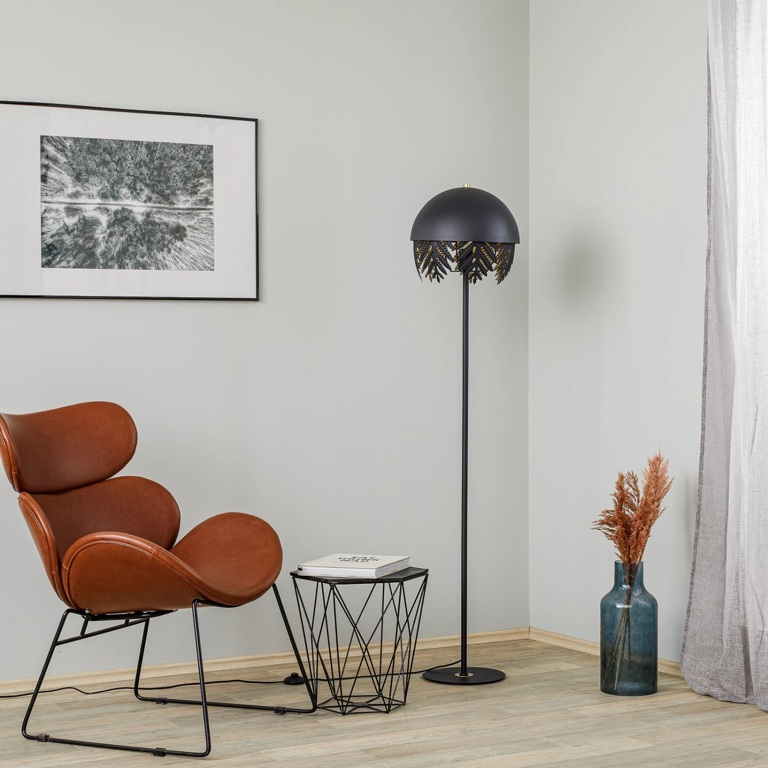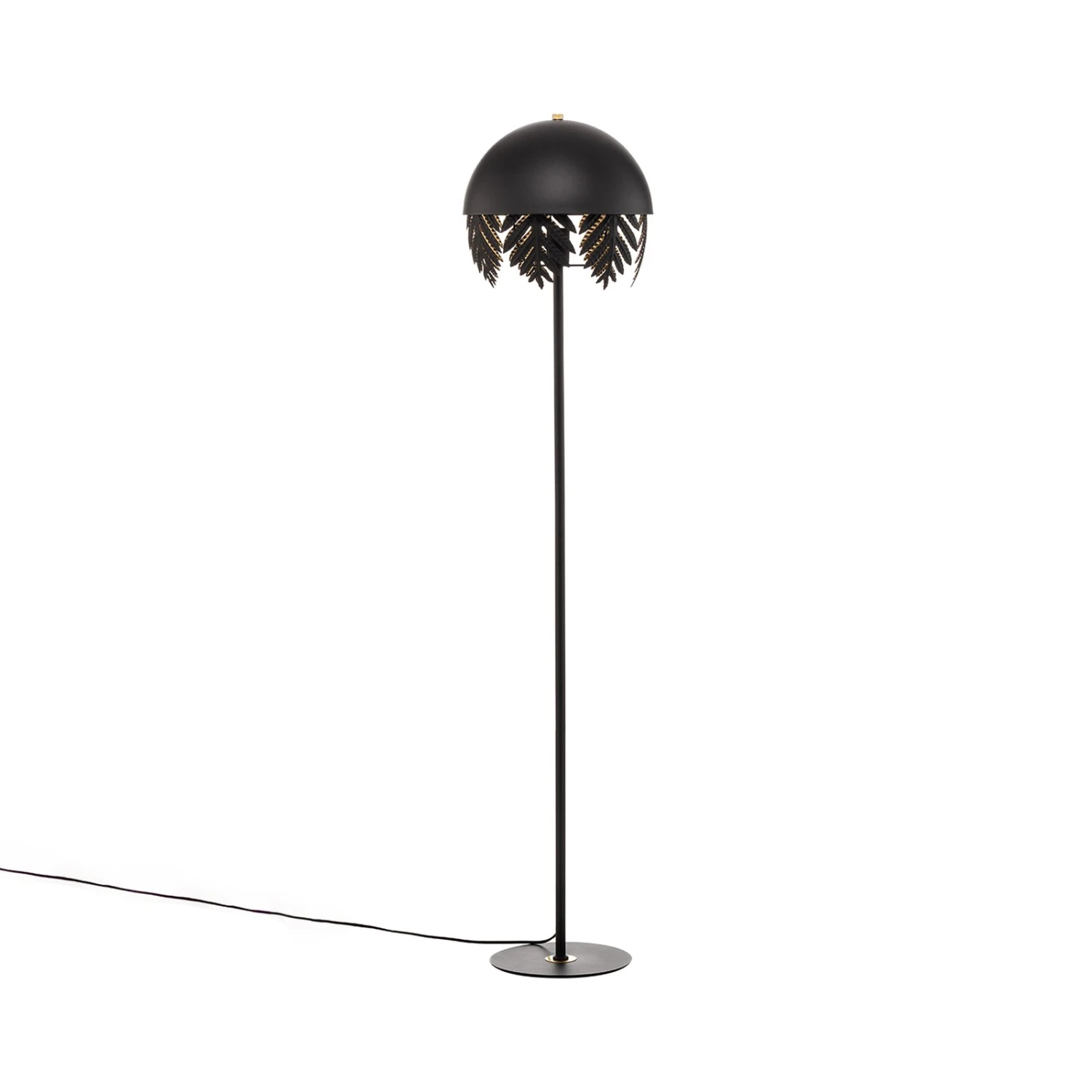 Diese nach Designmaßstäben gefertigte Stehleuchte ist ein echter Hingucker im Wohnbereich. Sie besteht komplett aus Eisen und ist ein Lichtspender, der durchgängig schwarz gefärbt, nur das Leuchteninnere erstrahlt golden, was nicht nur die Erscheinung der Leuchte verfeinert, sondern auch ihr Lichtbild warm und gemütlich erscheinen lässt. Oben sitzt ein zeitloser Schirm in Halbkugelform, so dass der Lichtschein per se nach unten gerichtet ist. Dekorative Elemente in Blattform führen den Schirm nach unten hin fort und blenden das Licht noch mehr ab, so dass es in puncto Behaglichkeit absolut überzeugen kann und eine sehr individuelle Ausstrahlung besitzt.
