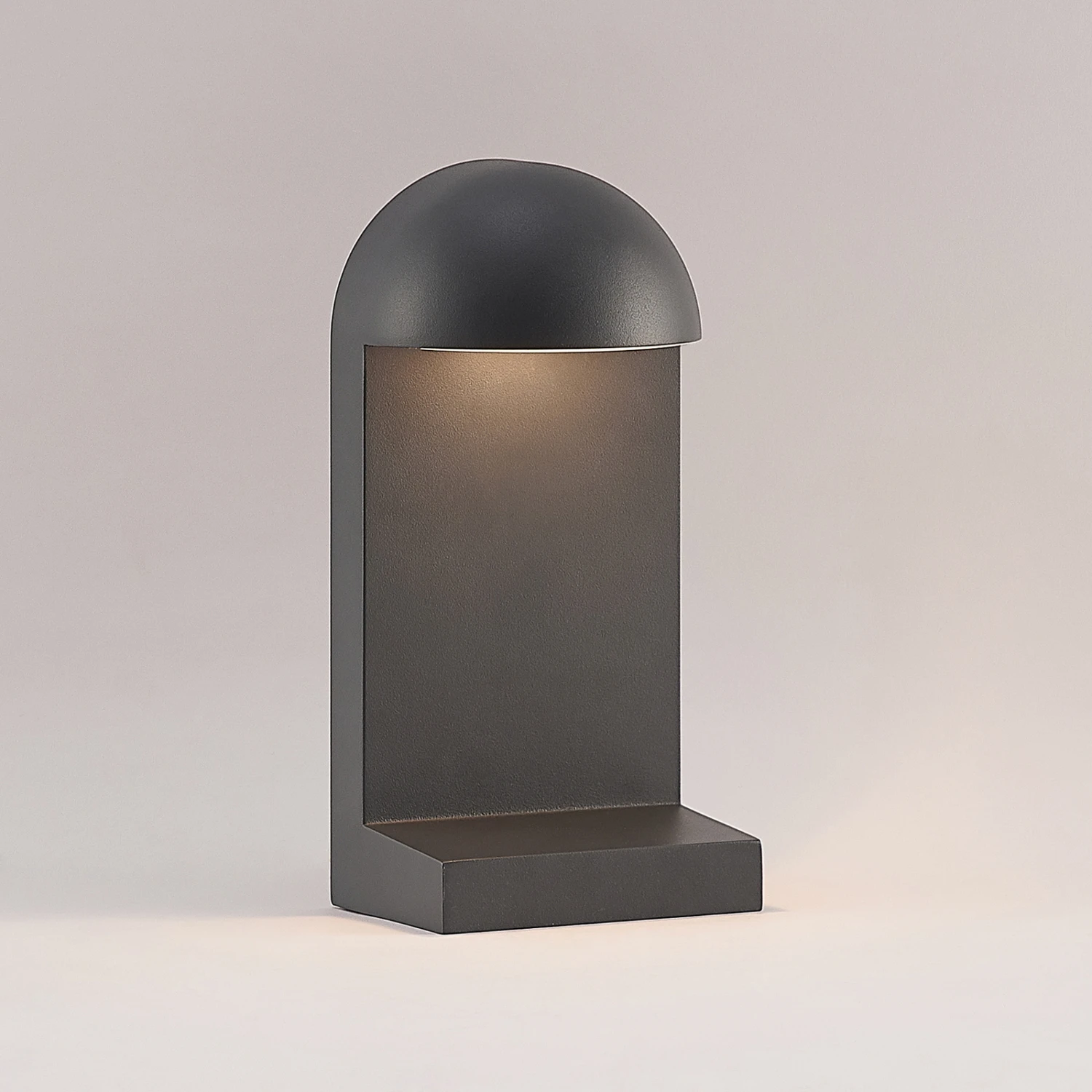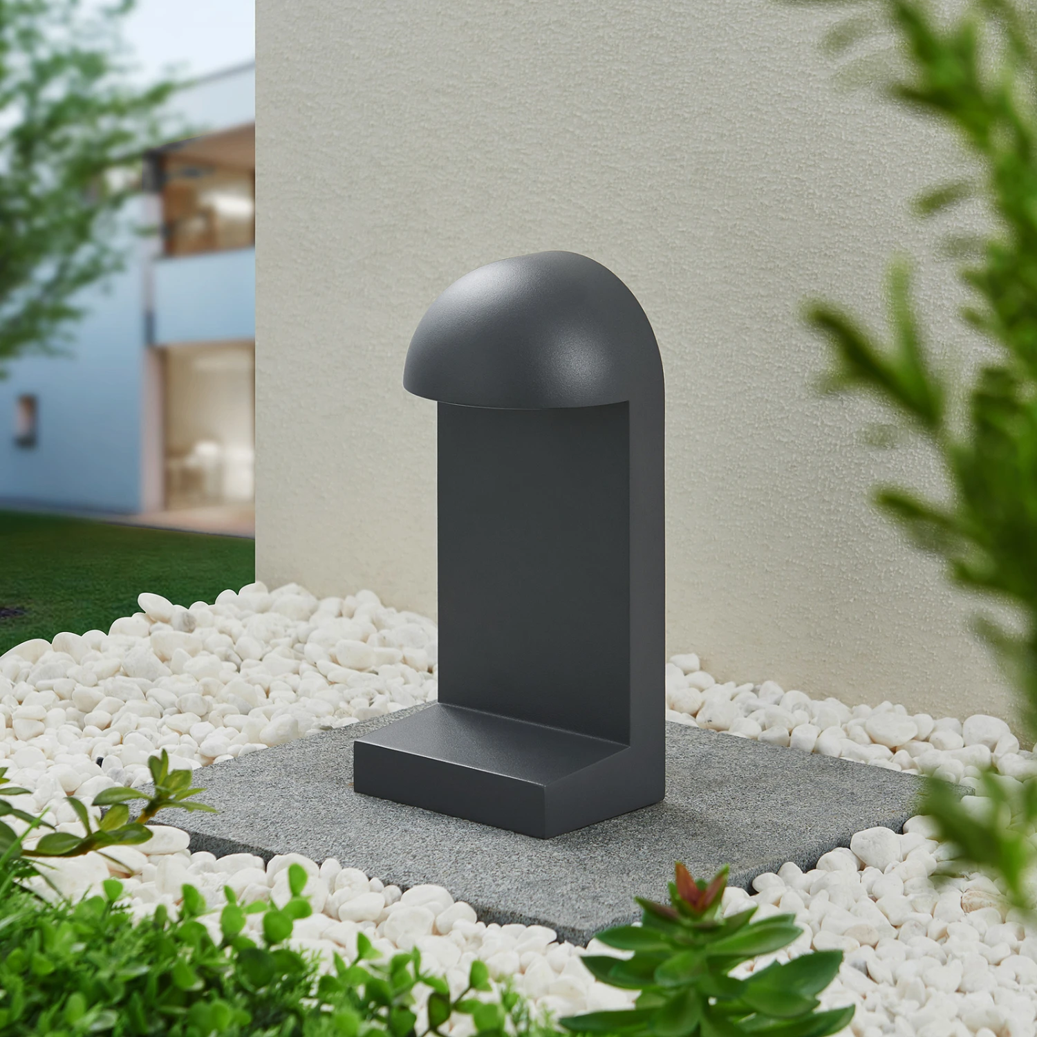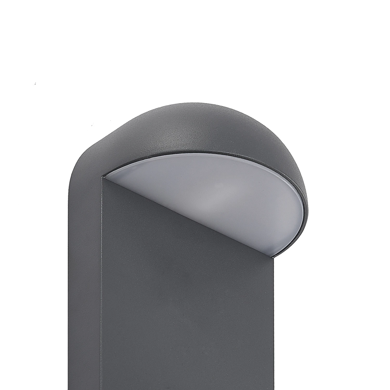 Der Leuchtenkörper von Jasmia besteht aus nach dunkelgrauem Aludruckguss und oben über dem Leuchtmittel sitzt eine Art Kuppel, die lichtundurchlässig ist und dafür sorgt, dass der Lichtschein besonders blendfrei austritt und nach unten gerichtet ist. So kann man sich stets gut orientieren, ohne direkt in die Lichtquelle zu schauen. Das Design mutet besonders modern an und lässt sich gut mit entsprechenden Außenumgebungen kombinieren.