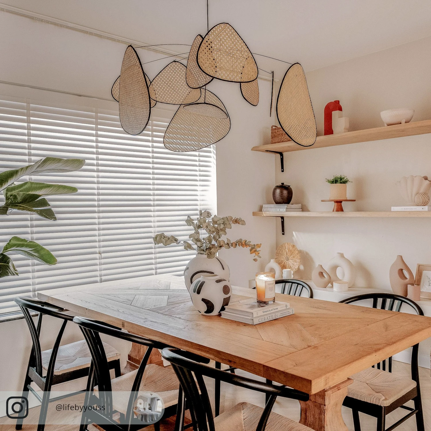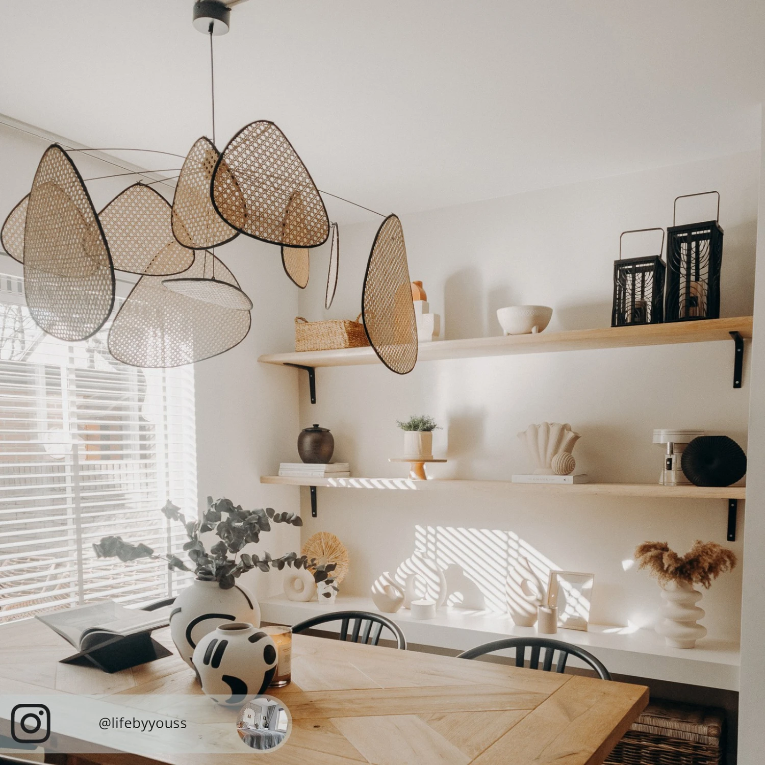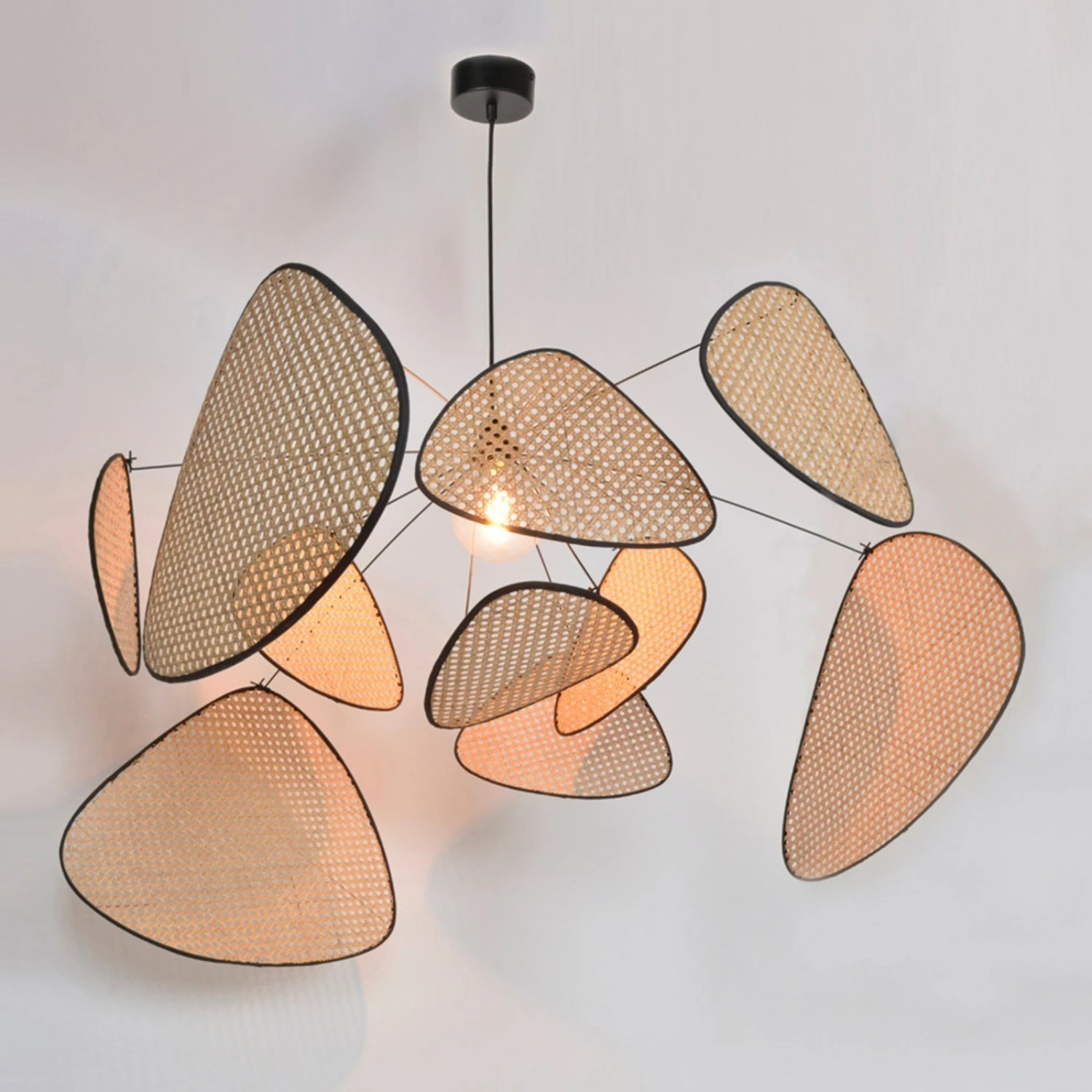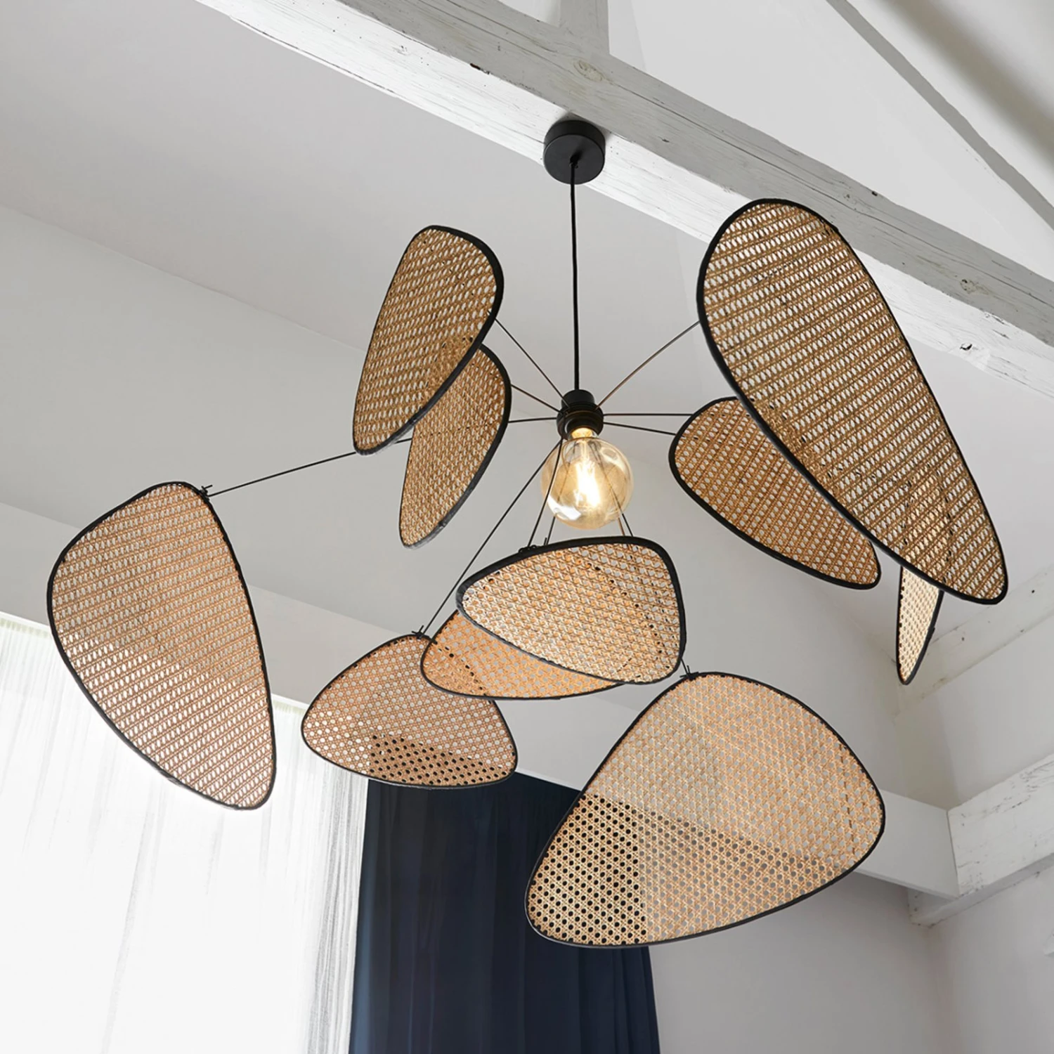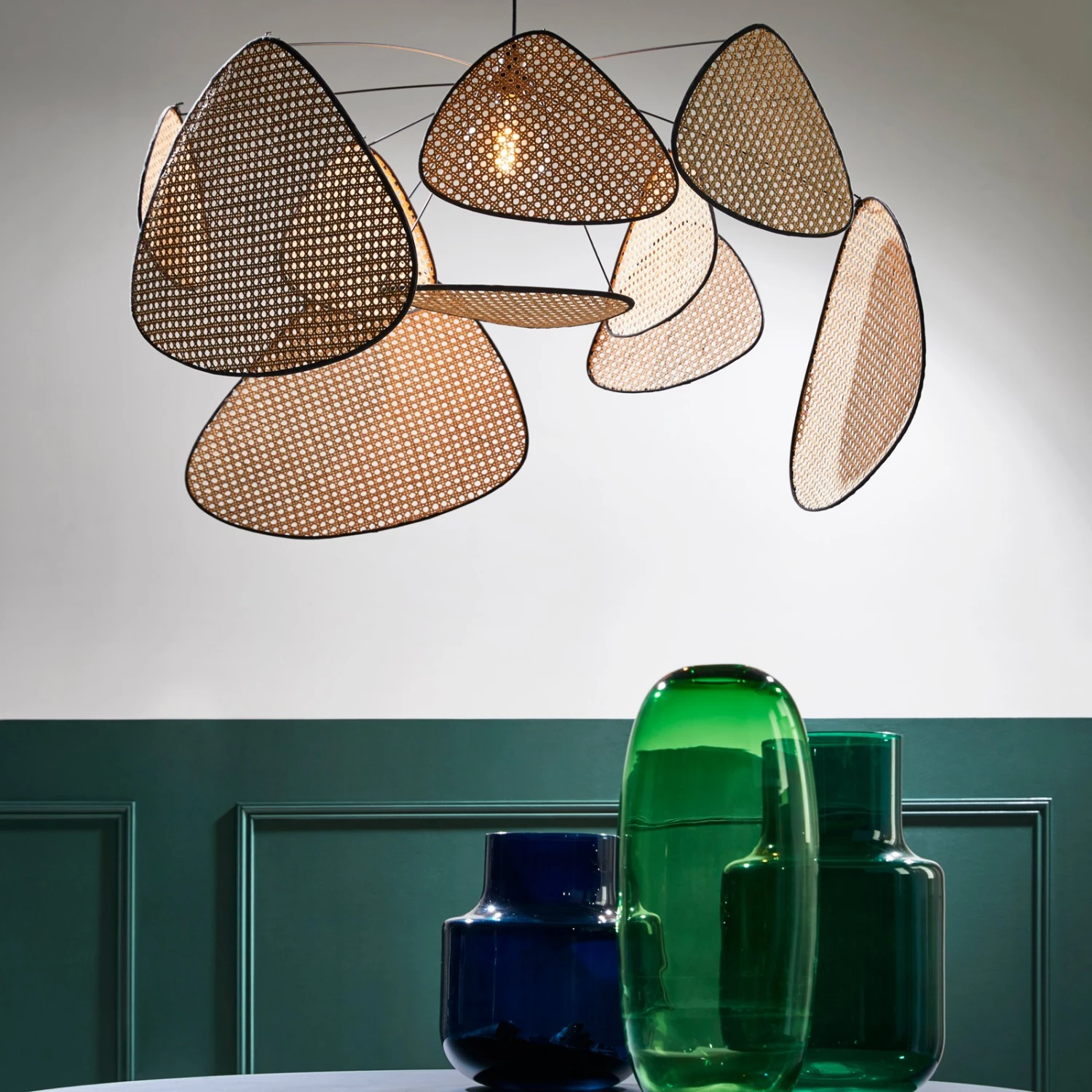 Die Hängeleuchte Screen verbreitet bereits unbeleuchtet eine große Wirkung, da sie mit den zehn unterschiedlich großen Schirmelementen im Flechtdesign wie ein Mobile wirkt und deshalb einen hohen dekorativen Stellenwert für die Raumgestaltung einnimmt. In der Mitte der Schirme ist die Leuchtmittelfassung verbaut, das eingesetzte Leuchtmittel (nicht enthalten) strahlt sein Licht gleichmäßig nach allen Seiten ab und setzt die Schirme dabei in Szene. Es entsteht eine behagliche Lichtwirkung mit sehr ästhetischem Licht- und Schattenspiel. Über einen extern verbauten Dimmer lässt sich die Helligkeit regulieren.
