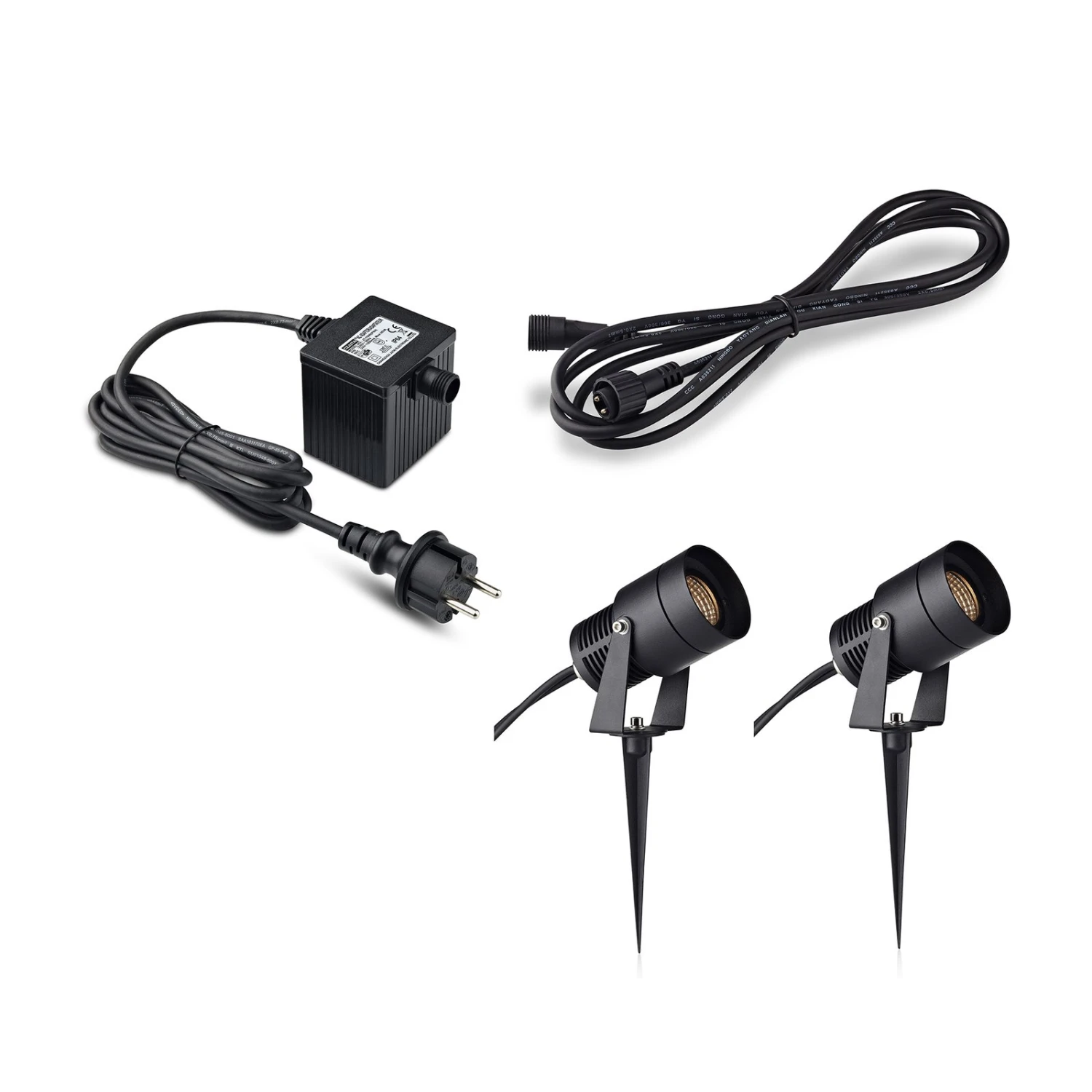 Mit diesem Starterset hat man sofort eine Basis für ein umfangreiches Garden 24V-System. Die enthaltenen Komponenten können mühelos miteinander verbunden werden und sofort zum Einsatz kommen, ohne das weiteres Zubehör benötigt wird. Bestehend aus zwei schwarzen LED-Spots mit Erdspießen, einem Verlängerungskabel und einem passenden Transformator mit 36 Watt, bietet dieses Starterset die Möglichkeit, noch weitere Produkte der Serie einzubinden. Mit den Spots können gewünschte Bereiche oder Objekte in Szene gesetzt werden und durch den Erdspieß lassen sie sich flexibel platzieren.