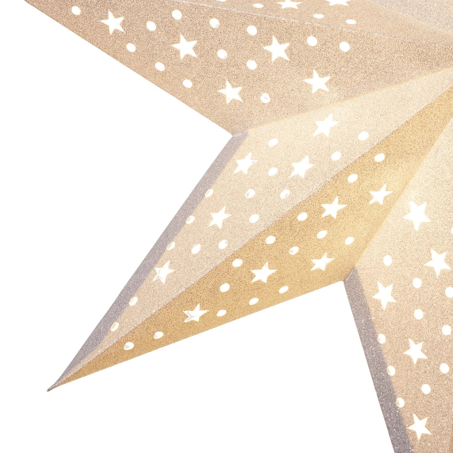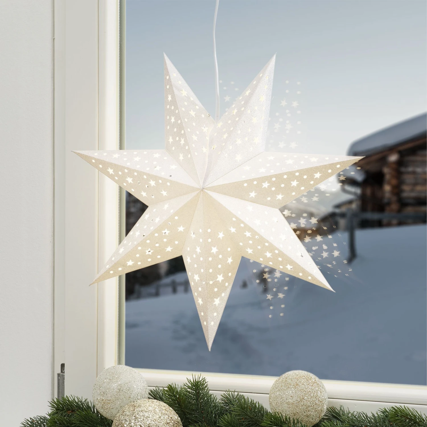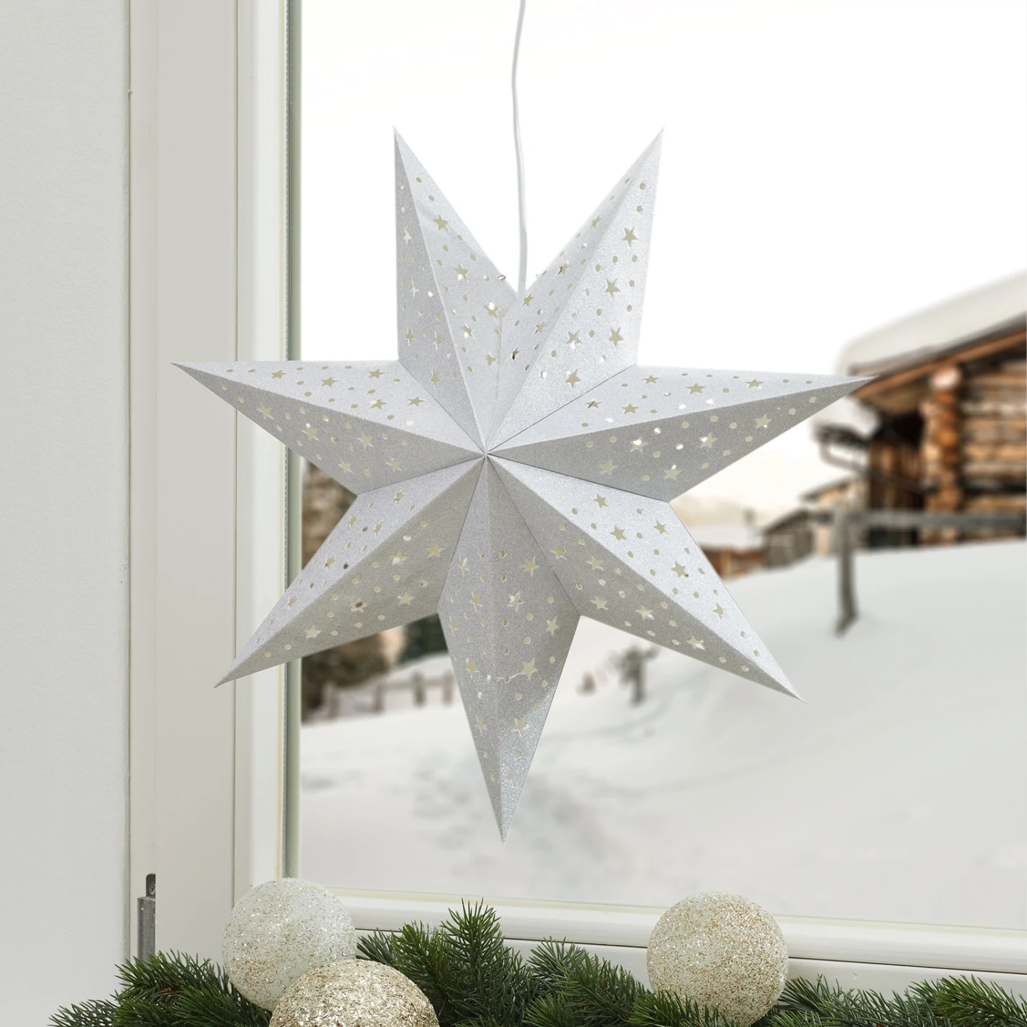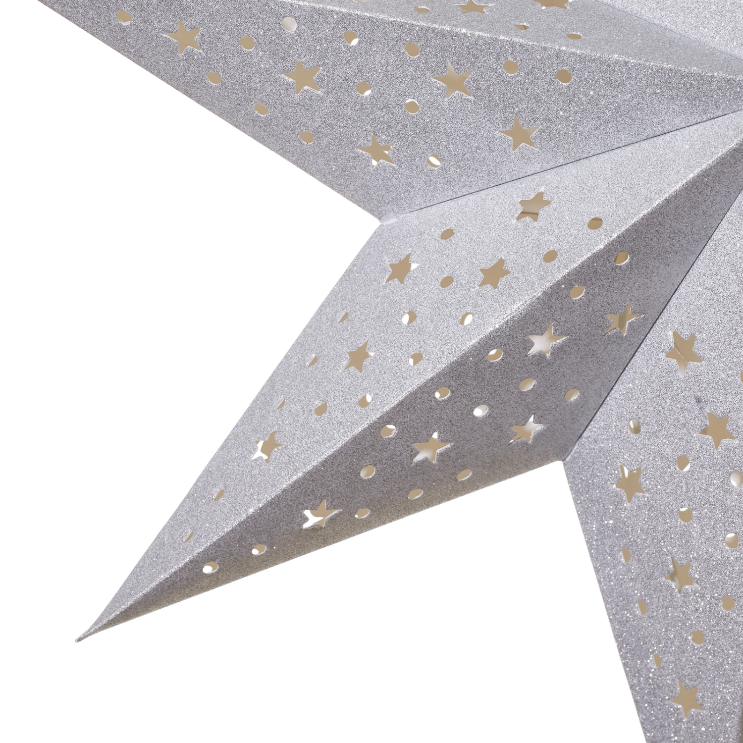 Sehr dekorativ wirkt der siebenzackige Papierstern Solvalla nicht nur aufgrund seiner schönen Form und der Farbgestaltung in festlichem Silber, sondern auch aufgrund des eingearbeiteten Durchbruchmusters aus Punkten und Sternen, durch die nach dem Einschalten der Beleuchtung das Licht scheint.