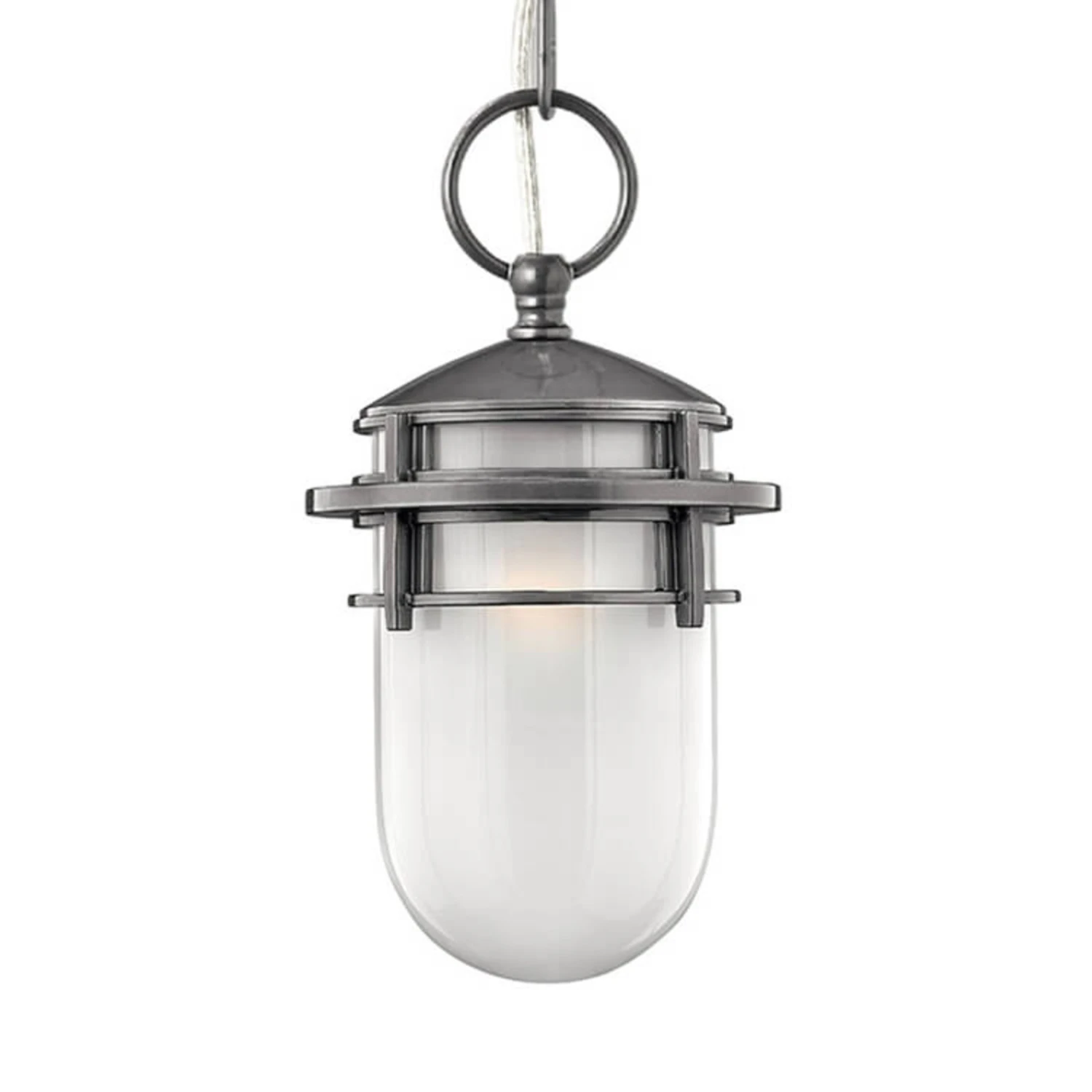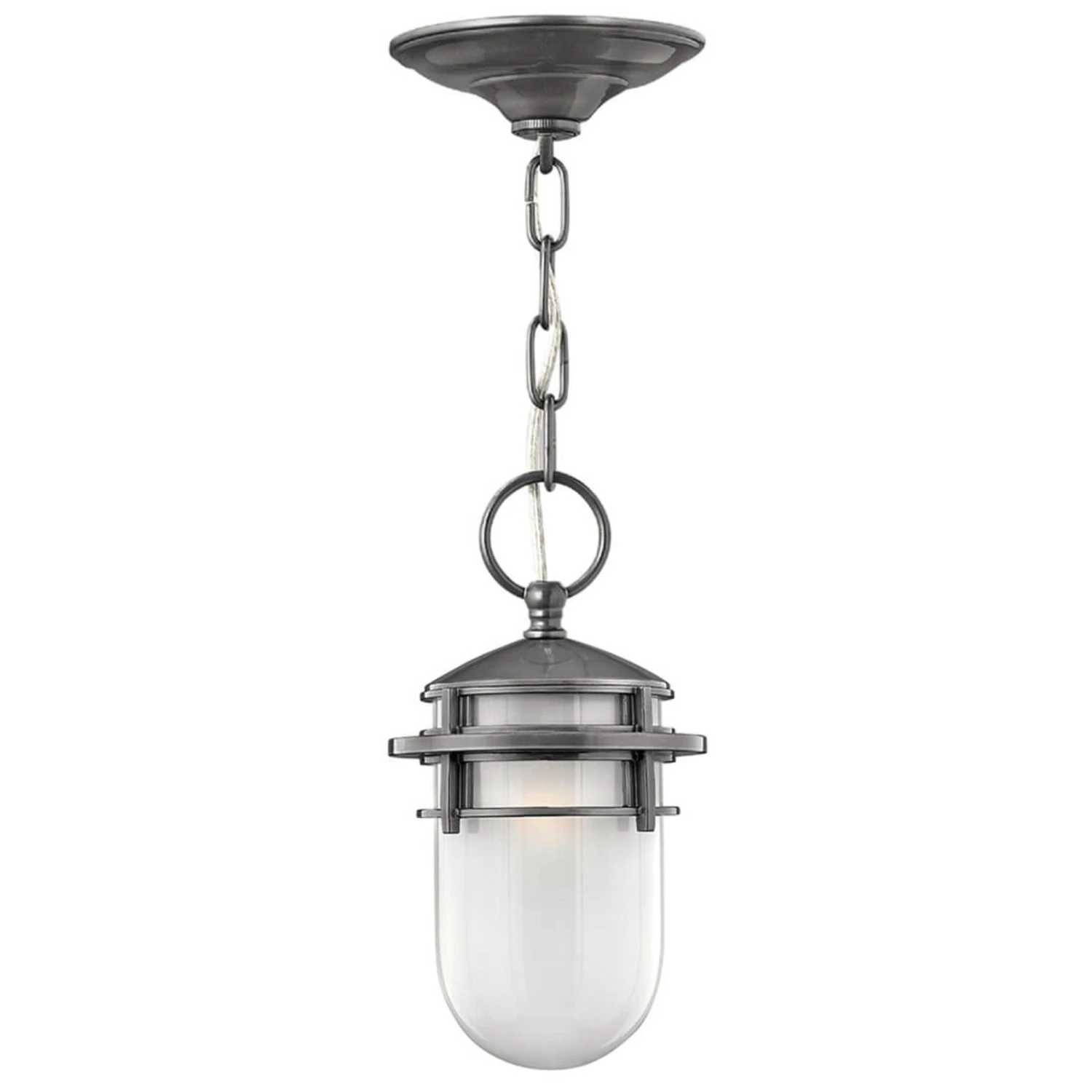 Die Optik der für den überdachten Außenbereich konzipierten Pendelleuchte Reef ist unübersehbar nautisch geprägt. Der große Glasschirm aus geätztem Glas wird von starken Ringen aus gegossenem Aluminium gehalten. Eine großgliedrige Kette sowie ein ebenfalls maritim designter Baldachin vervollständigen die schöne Reef.
