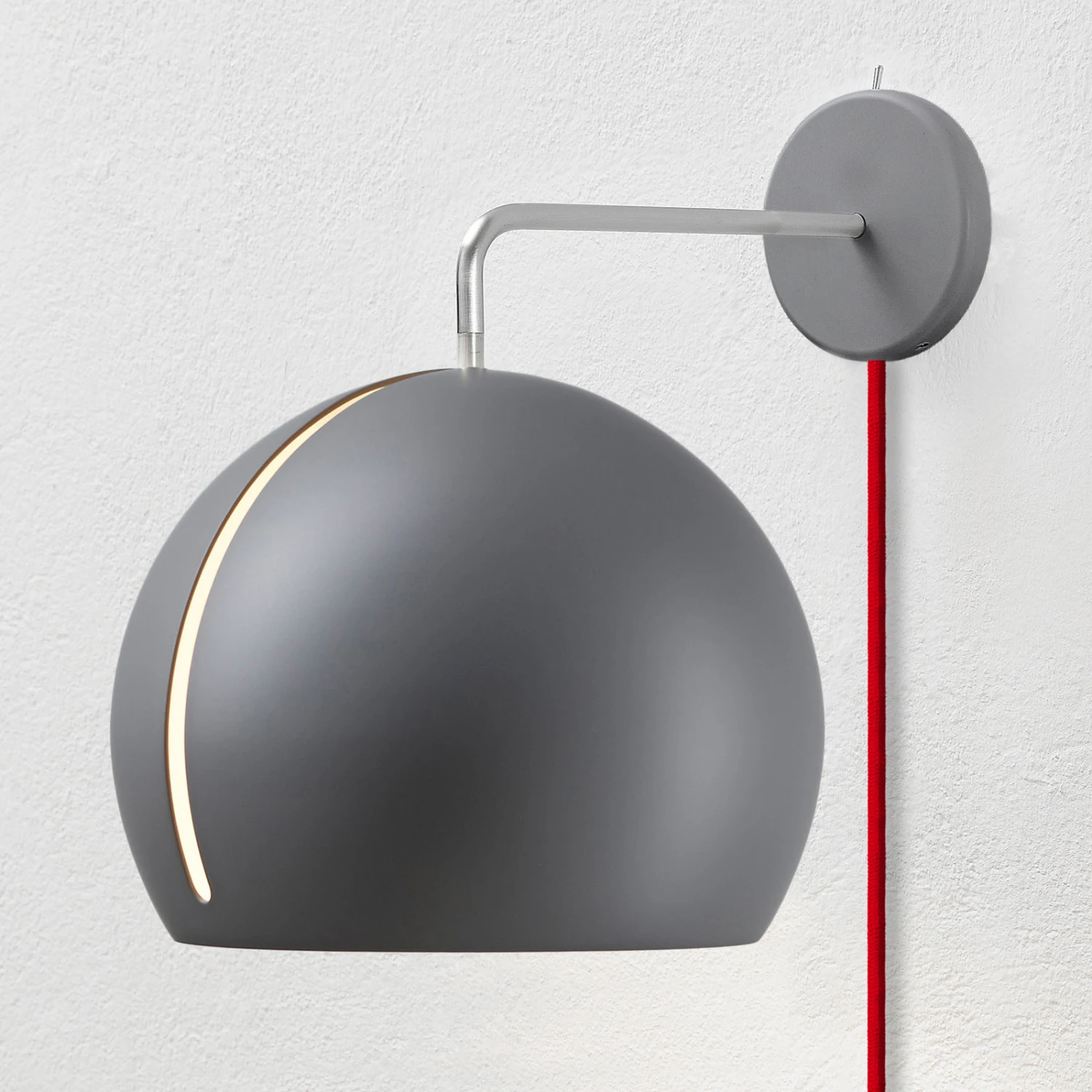 Das rote Kabel sticht bei dieser modernen Leuchte direkt ins Auge und wird als Designelement geschickt in Szene gesetzt. Die Wandleuchte Tilt Globe Wall aus dem Hause Nyta besteht aus einem matt lackierten Lampenschirm aus Aluminium, der wie eine unten offene Kugel gearbeitet ist und einen besonderen Schlitz auf der Vorderseite aufweist. Diese Öffnung am Schirm sorgt dafür, dass sich die Leuchte in jedwede Richtung drehen und schwenken lässt. Die Ausrichtung des Lichts kann somit jederzeit individuell variiert werden, ob es direkt in den Raum hinein leuchtend, nach unten strahlend oder auf ein bestimmtes Objekt ausgerichtet sein soll. Ein kleiner Schalter an der Wandhalterung sorgt zudem für ein bequemes und komfortables Ein- und Ausschalten. Dank des Kabels mit Stecker kann die Wandleuchte zudem mühelos montiert und im vielseitig in den verschiedensten Räumen verwendet werden.