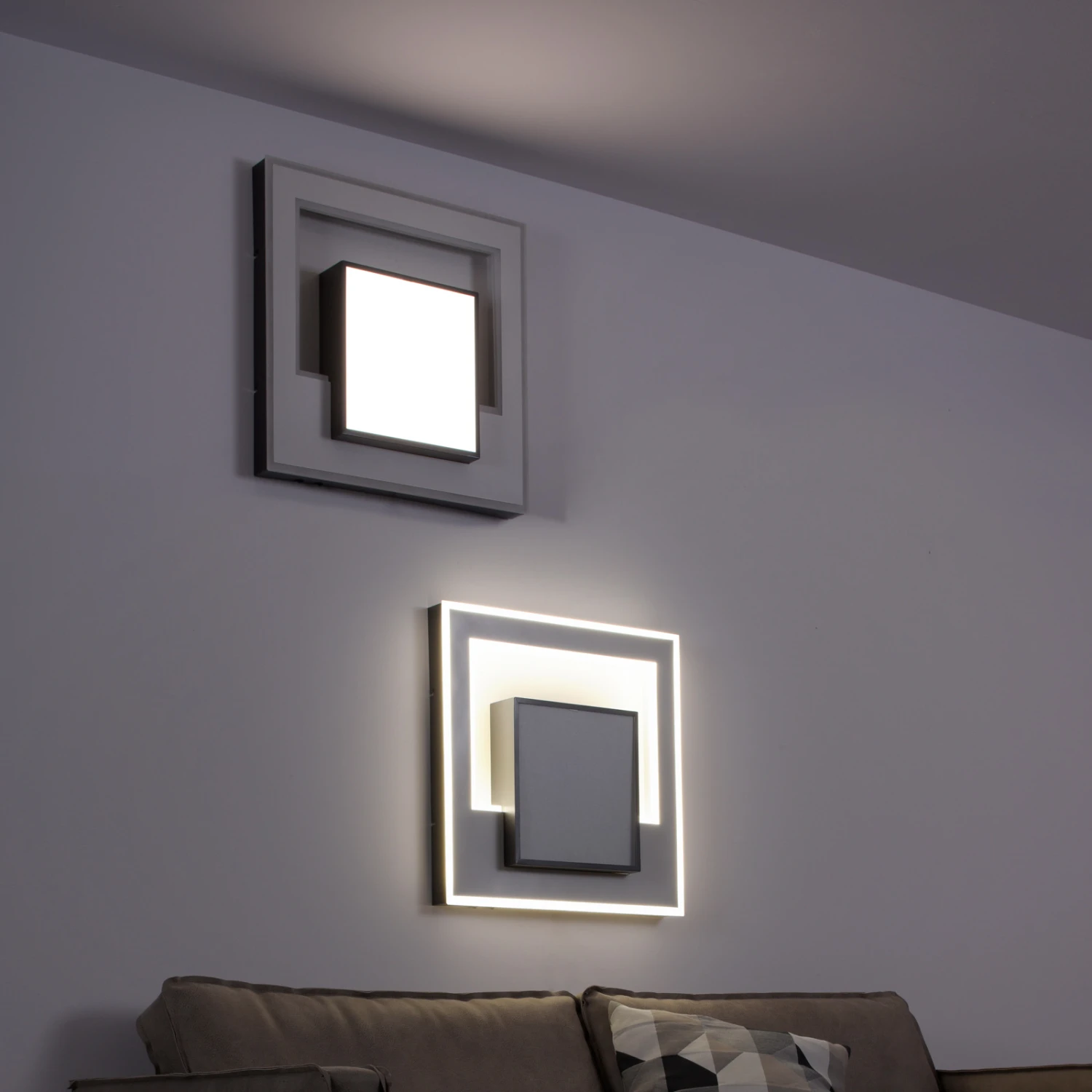 Ein ansprechendes, dreidimensional wirkendes Design aus übereinander angeordneten Quadraten, kombiniert mit vielseitigen Lichtoptionen und zeitgemäßen Möglichkeiten der Steuerung, machen die LED-Deckenleuchte Q-Alta zu einem Highlight für moderne Wohnkonzepte. Die schwarze Struktur aus Aluminium beherbergt drei Abschnitte mit LEDs hinter satiniertem Acryl – einen flächig strahlenden Bereich im unteren Quadrat und zwei Rahmen an der Außenkante und am inneren Ausschnitt. Die Lichtflächen können getrennt angesteuert werden. Hierzu wird eine Fernbedienung mitgeliefert, die das Schalten, Dimmen und Regeln der Farbtemperatur für alle Lichtquellen oder separat ermöglicht. Die ZigBee-Fähigkeit erlaubt zudem die smarte Einbindung zur Steuerung per App oder Sprachbefehl.