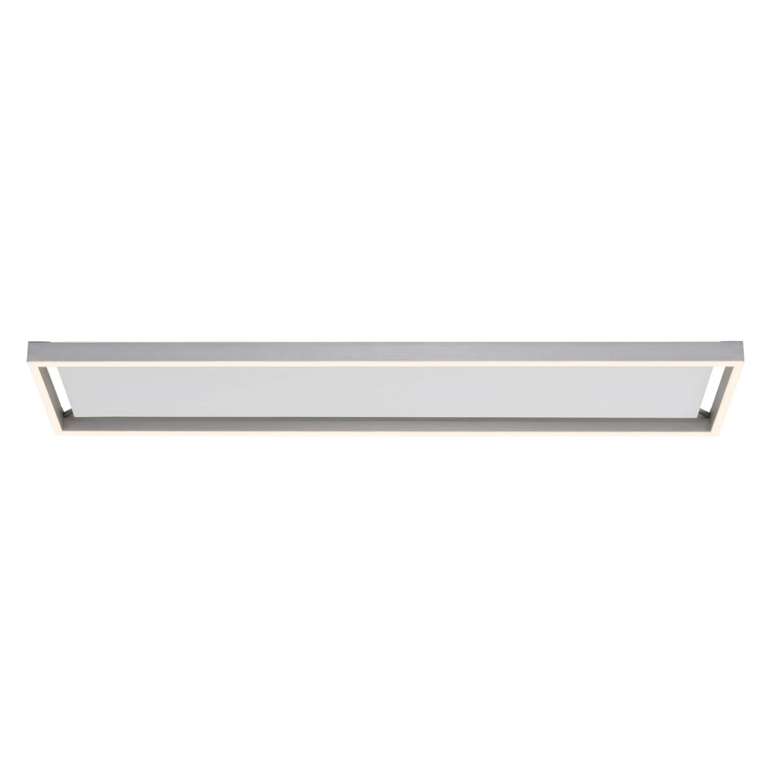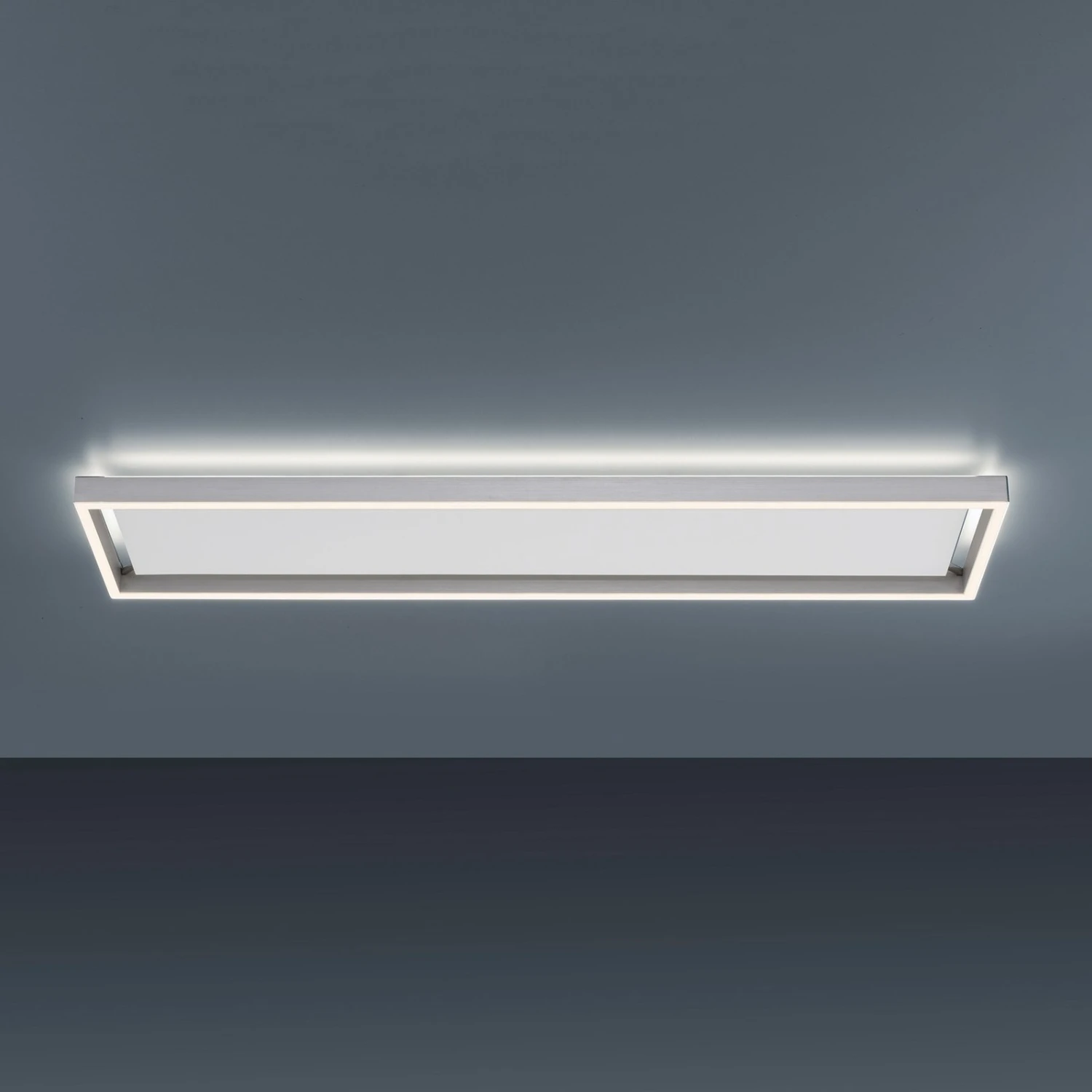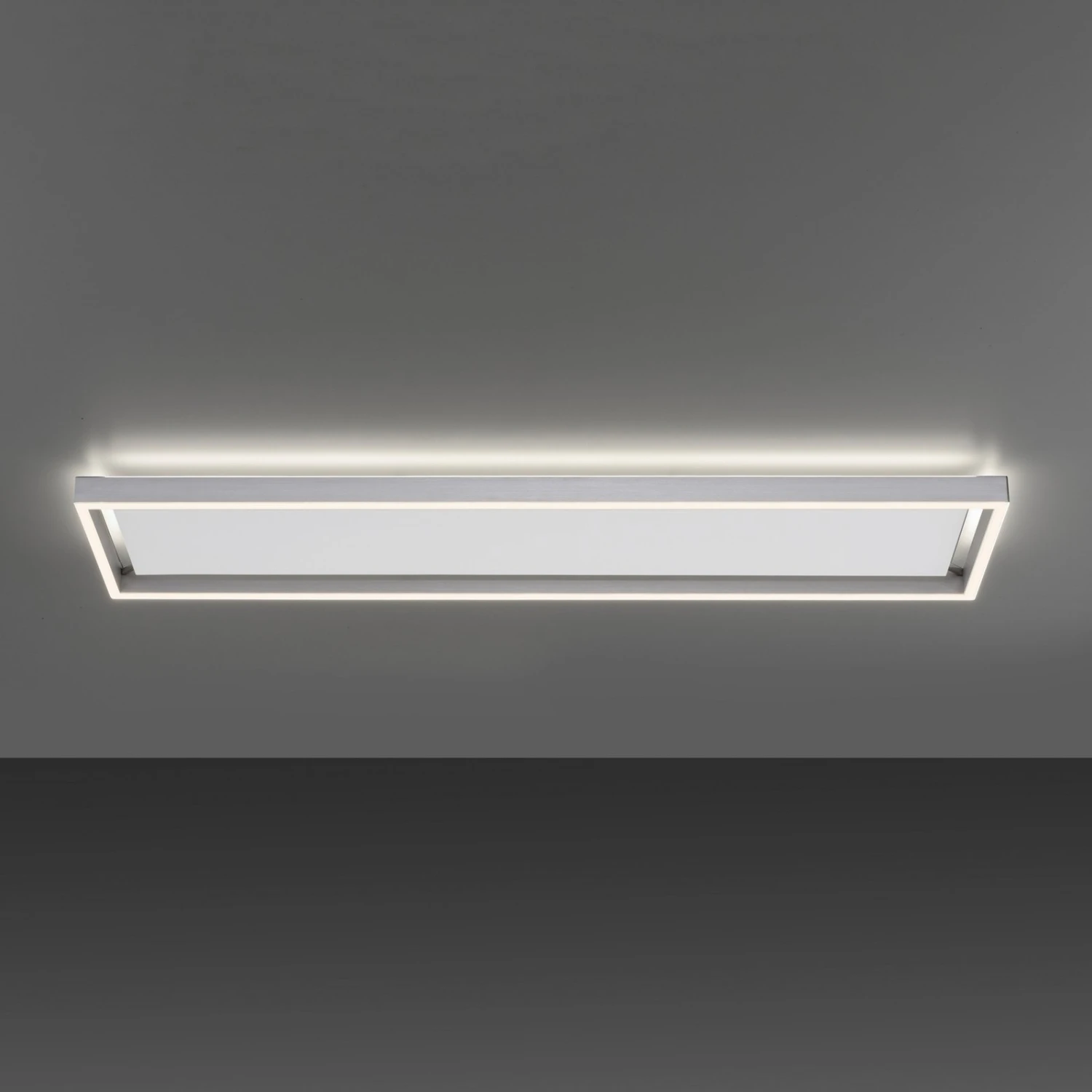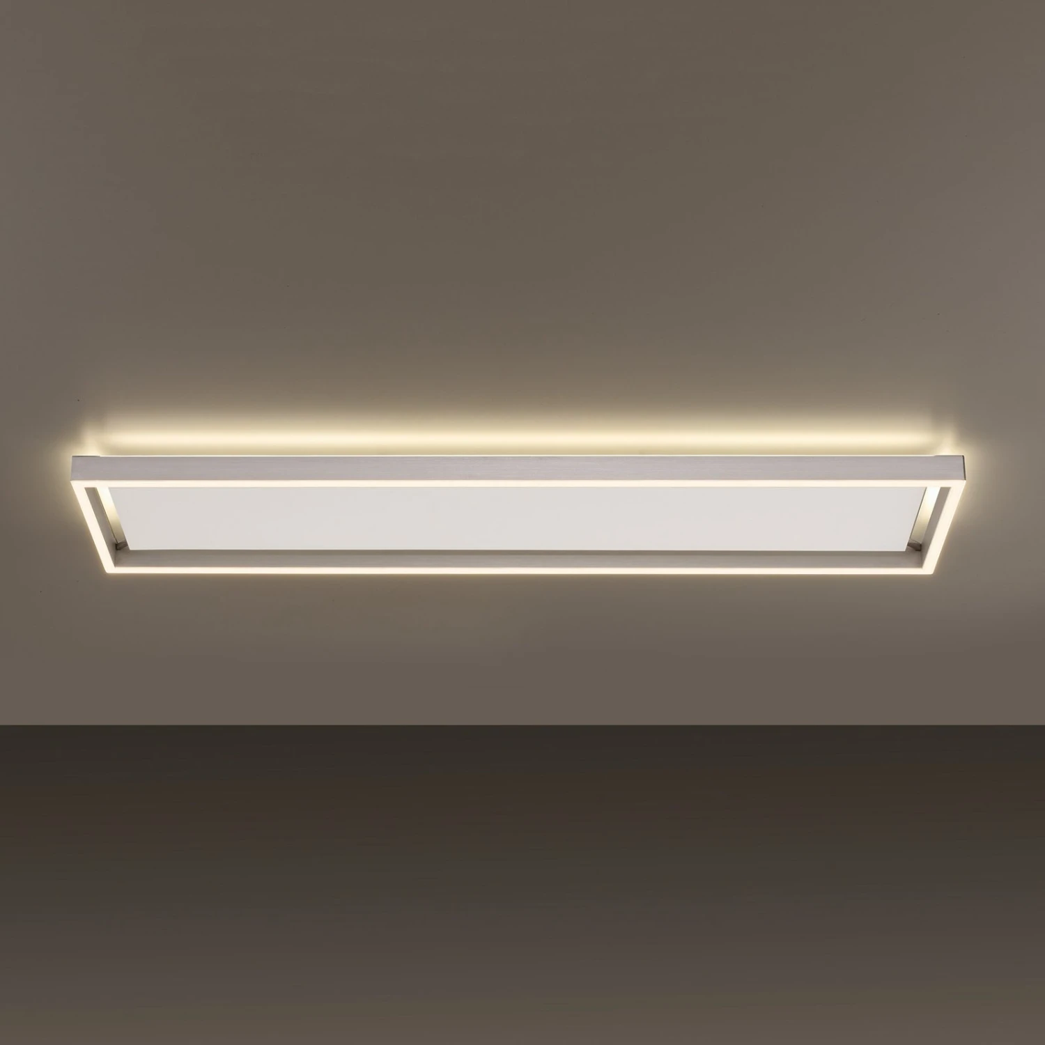 Die LED-Deckenlampe Q-Kaan ist ein modernes, zurückhaltendes Beleuchtungsobjekt, das sich besonders für die Ausleuchtung von Arbeitsbereichen in Küchen eignet. Ihre längliche, rechteckige Form ergibt sich aus einem Rahmenkonstrukt mit einer silbernen Innenfläche. Durch das oben und unten verbaute LED-Modul entsteht neben einem umfangreichen direkten Licht auch ein indirektes Licht, das den Raum sanft erhellt.