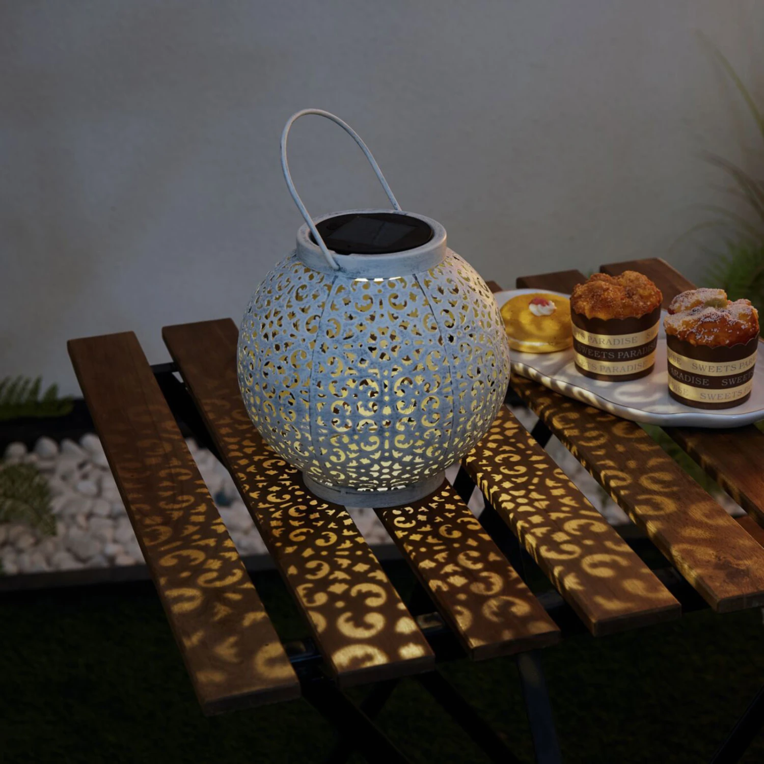 Die Solar-Laterne Sunshine Jewel mit ihrer weißen Vintage-Oberfläche zaubert romantische Lichteffekte in den Außenbereich. Das Solarpanel lädt sich tagsüber im Sonnenlicht auf und wird abends automatisch eingeschaltet. Der inkludierte Akku bietet eine Leuchtdauer von bis zu 8 Stunden täglich. Die goldene Innenbeschichtung des Metallkonstrukts lässt das Licht besonders warm wirken. Mit dem Henkel lässt sich die Leuchte auch in Bäumen oder an Überdächern anbringen.