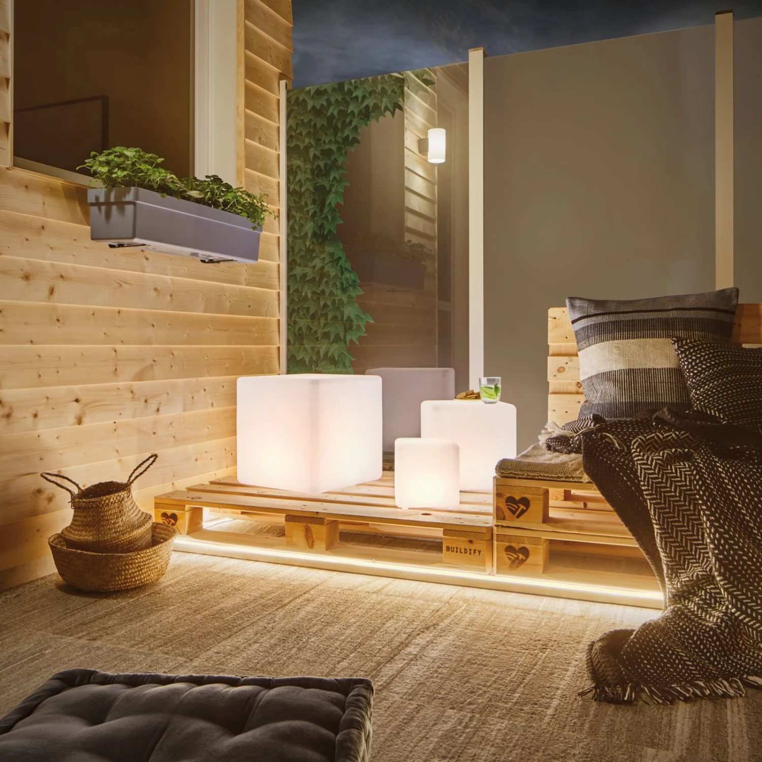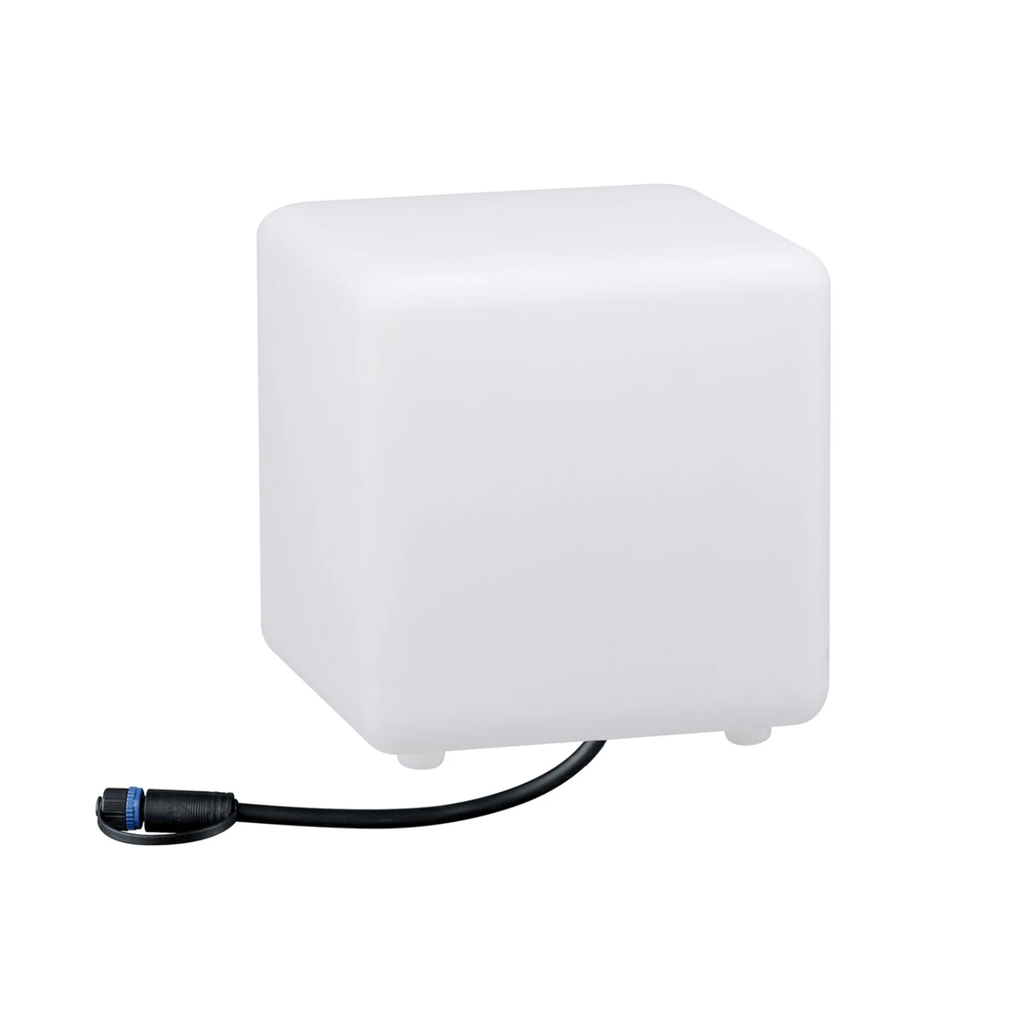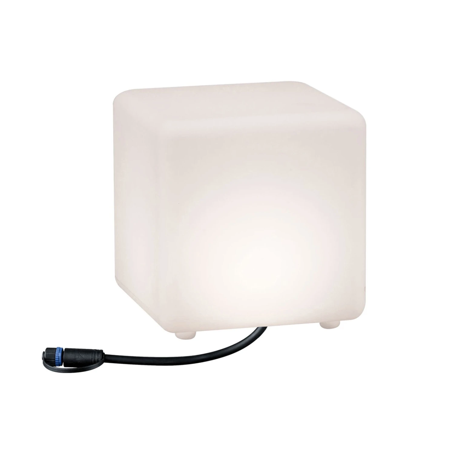 Ob auf der Terasse oder im Garten – die wasserdichte Dekoleuchte Cube bereichert den gewünschten Ort mit einem Lichtakzent. Bei Bedarf ist die Verankerung mit dem beiliegenden Erdspieß möglich. Der Kubus aus weißem, transluzentem Kunststoff harmoniert optisch mit modern gestalteten Außenbereichen.