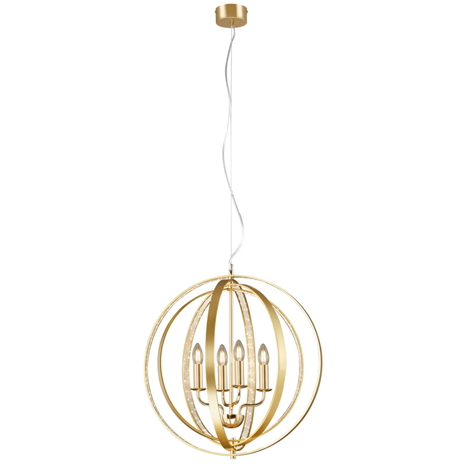 Das Modell zeichnet sich gleichzeitig durch eine schlanke Linienführung und prunkvollen Dekor aus. Die filigran gestaltete Kugel setzt einen stimmungsvollen Kontrapunkt zur geradlinigen Optik der kerzenförmigen Leuchtmittelfassungen. Für ein abwechslungsreiches Erscheinungsbild sorgt zusätzlich eine beeindruckende Kombination von dezent mattierten und satinierten Oberflächen mit edlem Messingfinish. Von den luxuriösen Leuchten der vergangenen Jahrhunderte inspiriert, besticht die Pendellampe Candela durch ihr stilvolles, modernes Flair.