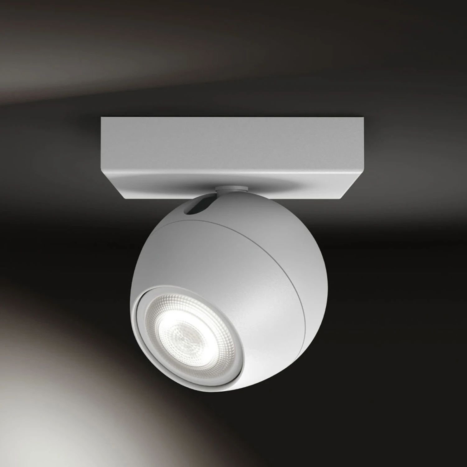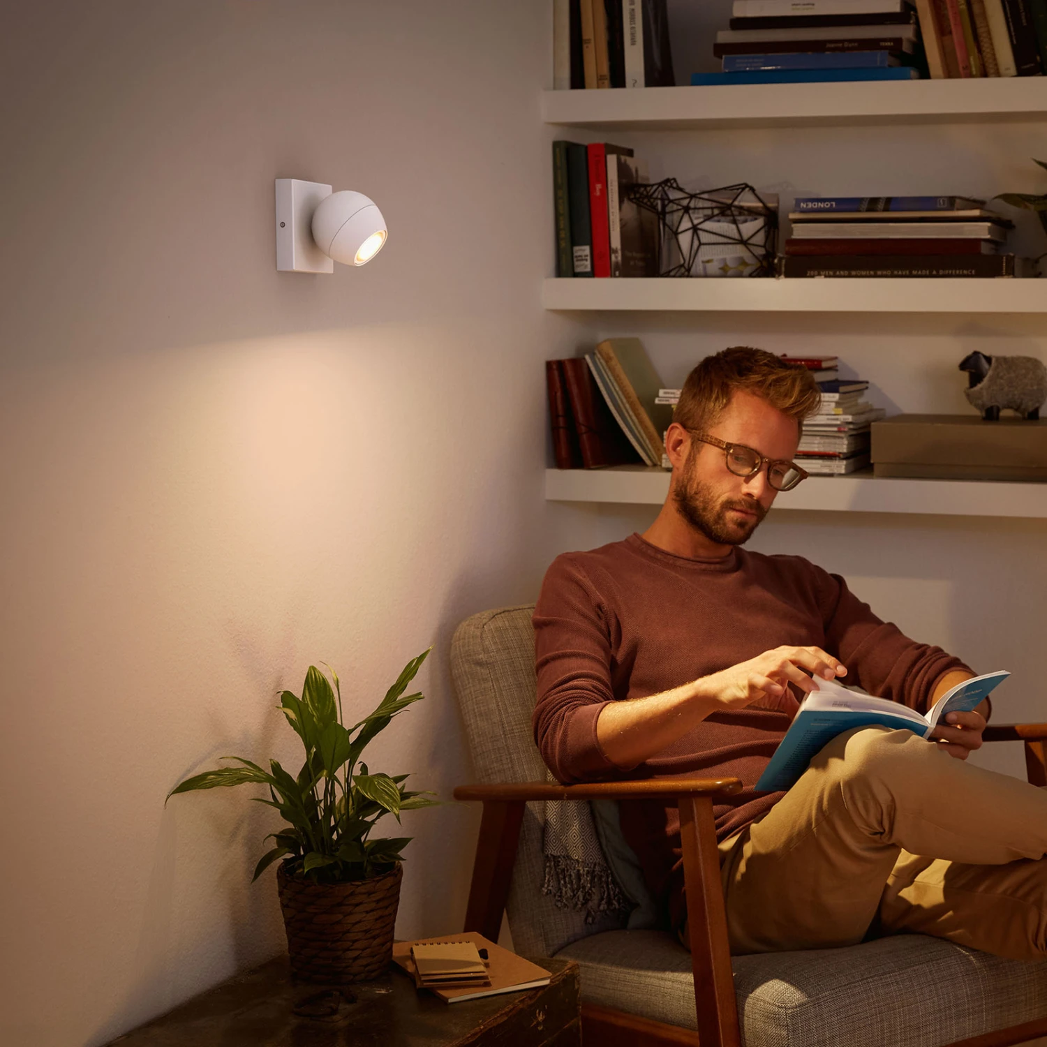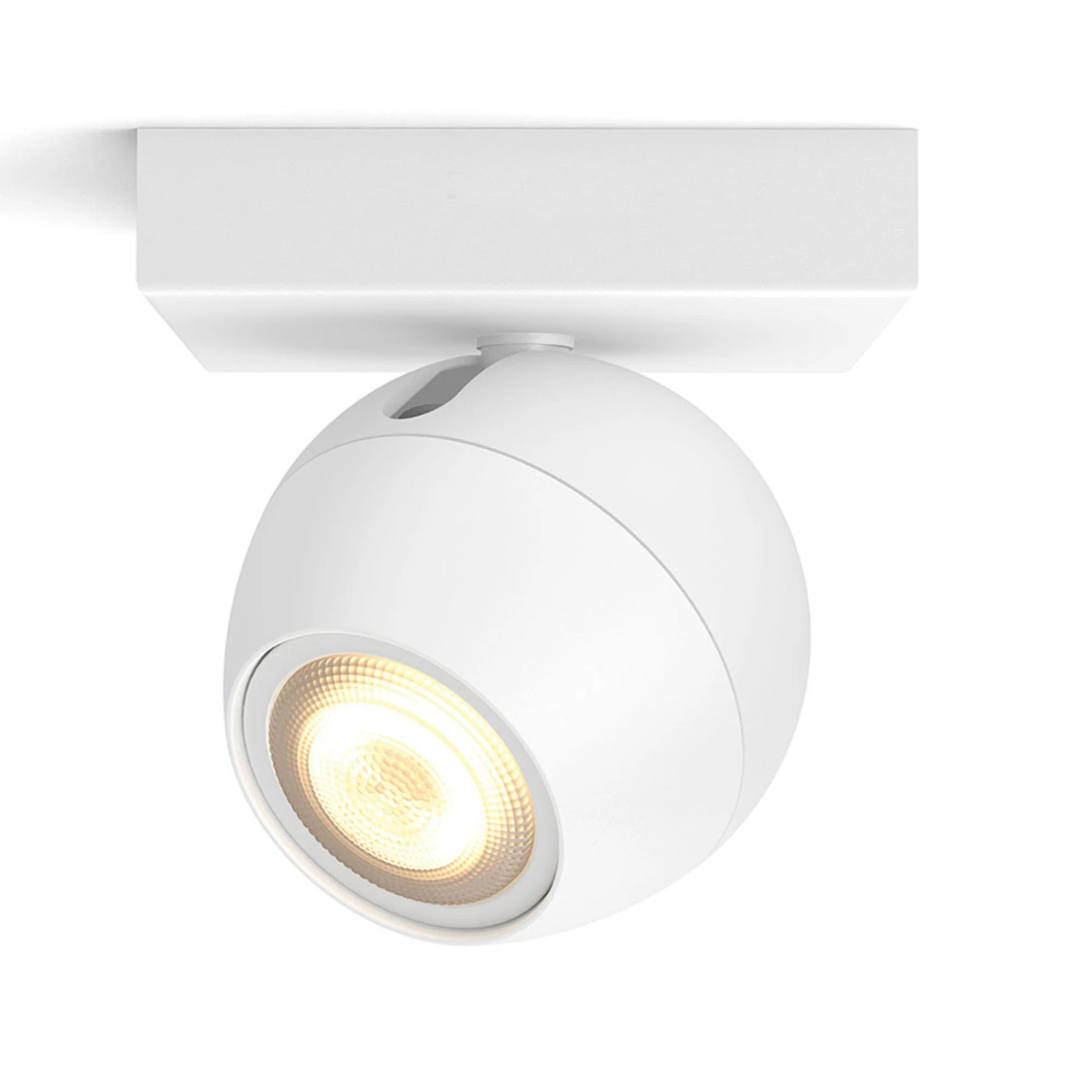 Zur Erweiterung eines bestehenden Philips Hue Systems oder einer Philips Hue Leuchte mit Dimmschalter dient dieser einflammige LED-Deckenspot Buckram, der ohne Dimmschalter geliefert wird. Er kann entweder mit einem vorhandenen Dimmschalter bedient werden oder in ein vorhandenes Philips Hue System integriert werden. Voraussetzung hierfür ist eine Philips Hue Bridge, die die Verbindung zwischen dem Strahler und dem Smartphone oder Tablet herstellt, so dass nach erfolgter Installation des Strahlers über die Hue App die Steuerung des Lichtes mit einem Tablet oder Smartphone möglich ist. Neu ist auch die Bedienung des Strahler via Bluetooth und die Hue Bluetooth-App.
