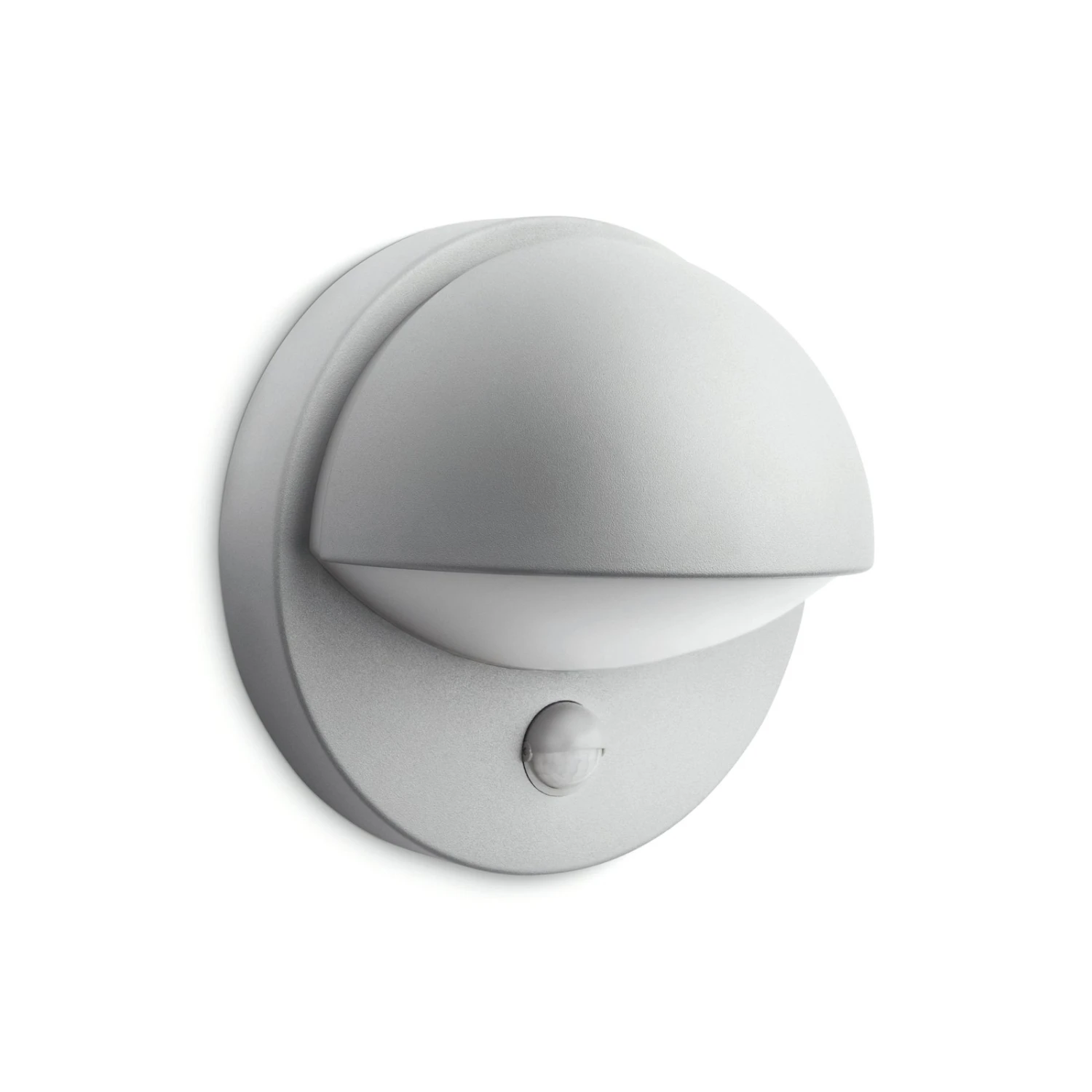 Die LED-Außenwandleuchte June in schöner Form strahlt ihr warmweißes Licht durch die halbrunde Metallschale oben und den darin nach unten gewölbten Diffusor ausschließlich im weiten Bereich nach unten ab und schaltet sich durch den integrierten Sensor immer dann automatisch ein, wenn Licht benötigt wird.