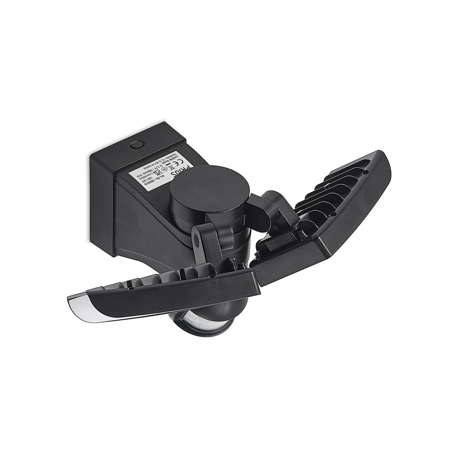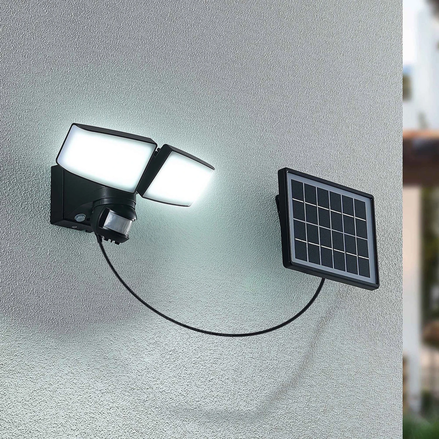 Der LED-Solar-Wandstrahler Kalvito wurde aus Kunststoff hergestellt und besitzt zwei leuchtstarke LED-Module, die mithilfe eines Solarpanels betrieben werden. Die LEDs bieten genügend Leuchtkraft in der Lichtfarbe Tageslicht, was gerade zu Abendstunden am Hauseingang oder an der Einfahrt äußerst praktisch ist. Die Spots sind bei Bedarf schwenkbar, wodurch der Abstrahlwinkel individuell bestimmt werden kann. Der integrierte Sensor registriert in einem Winkel von 140° und in einer Entfernung von maximal 10 Metern Bewegungen. Außerdem lässt die Leuchtdauer sich zwischen 3 Sekunden und 7 Minuten individuell einstellen. Die Schutzart IP44 sorgt für eine gute Langlebigkeit dieser Leuchte im Außenbereich.