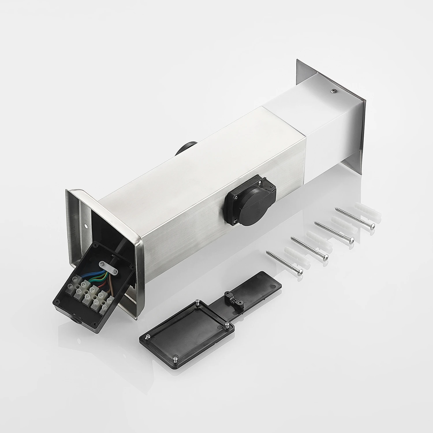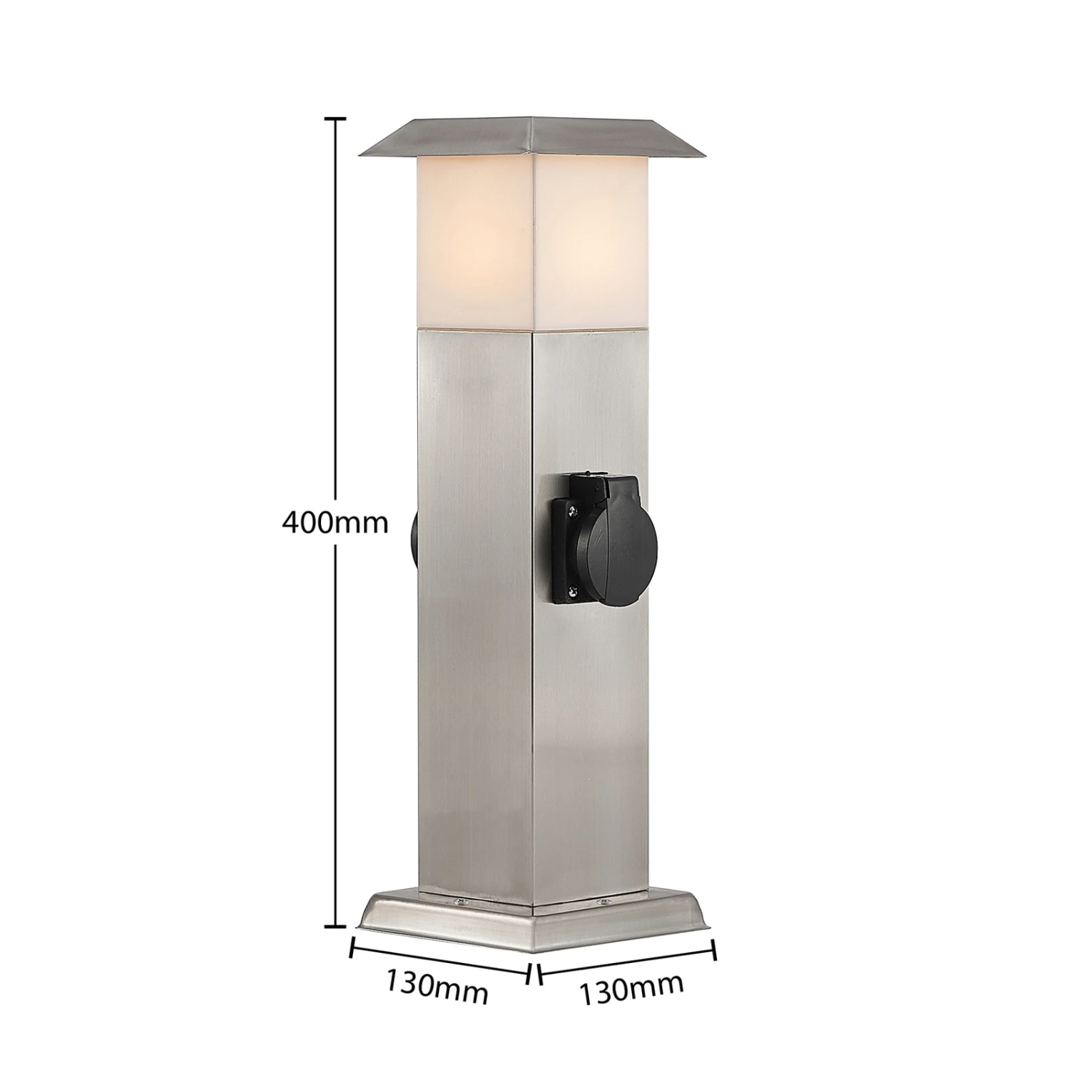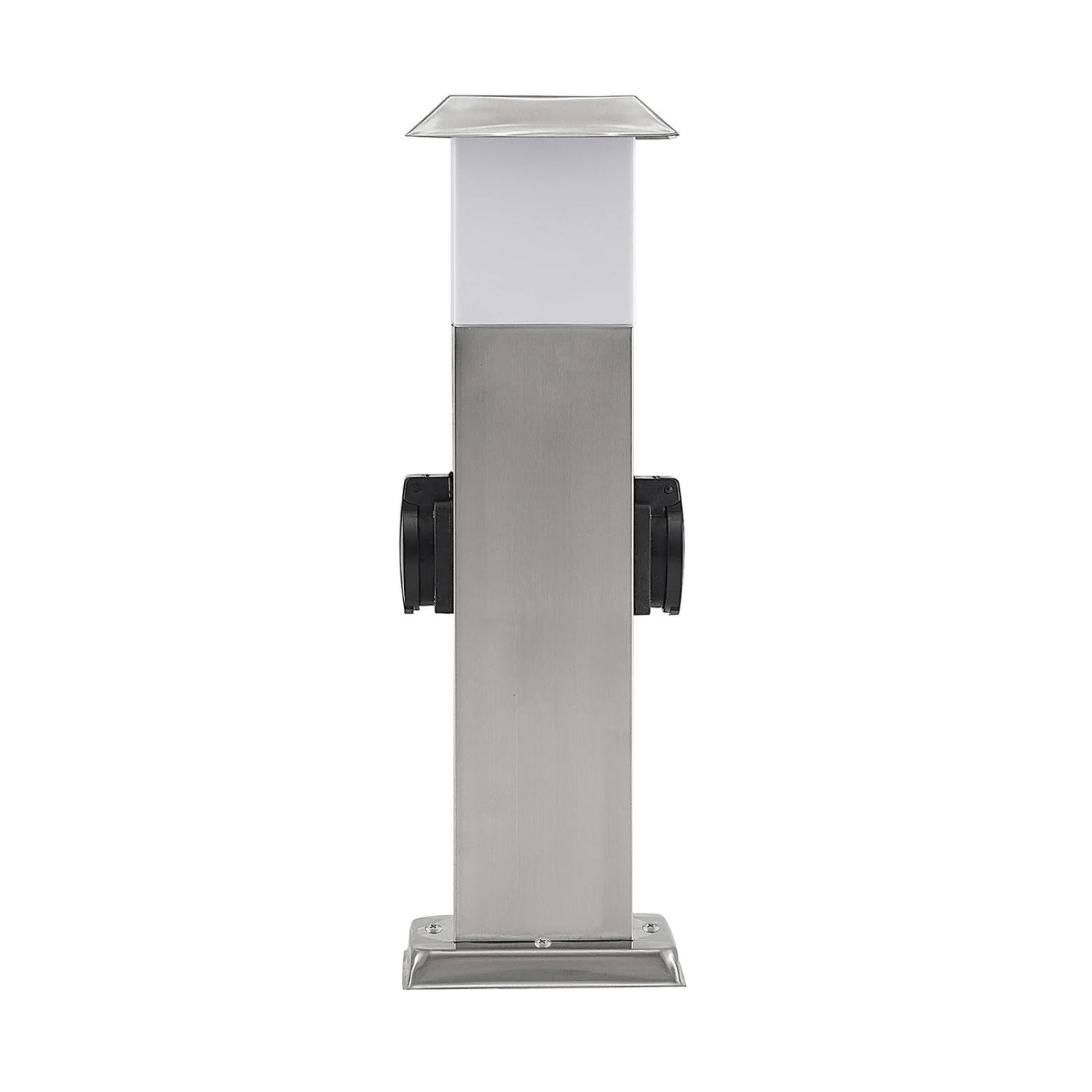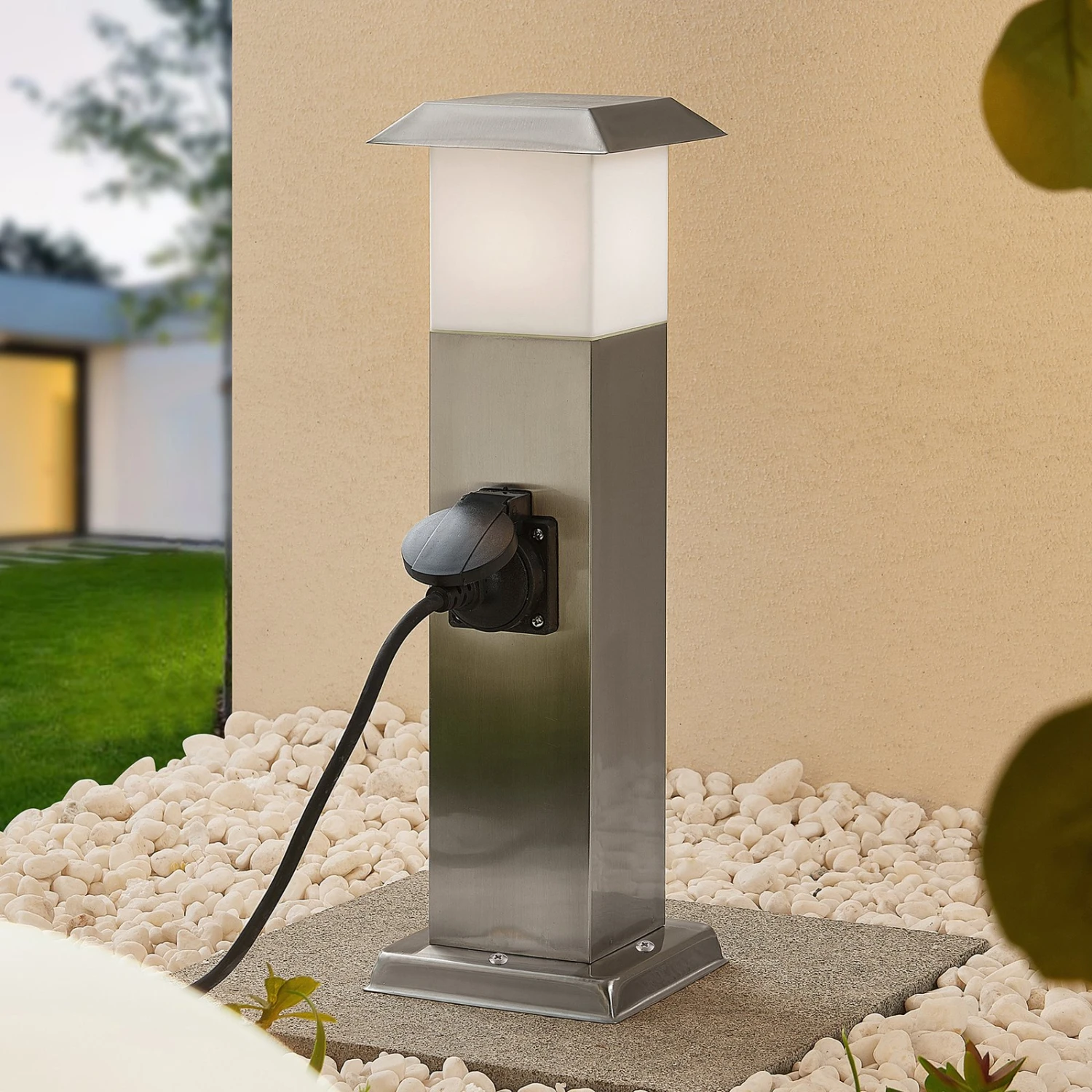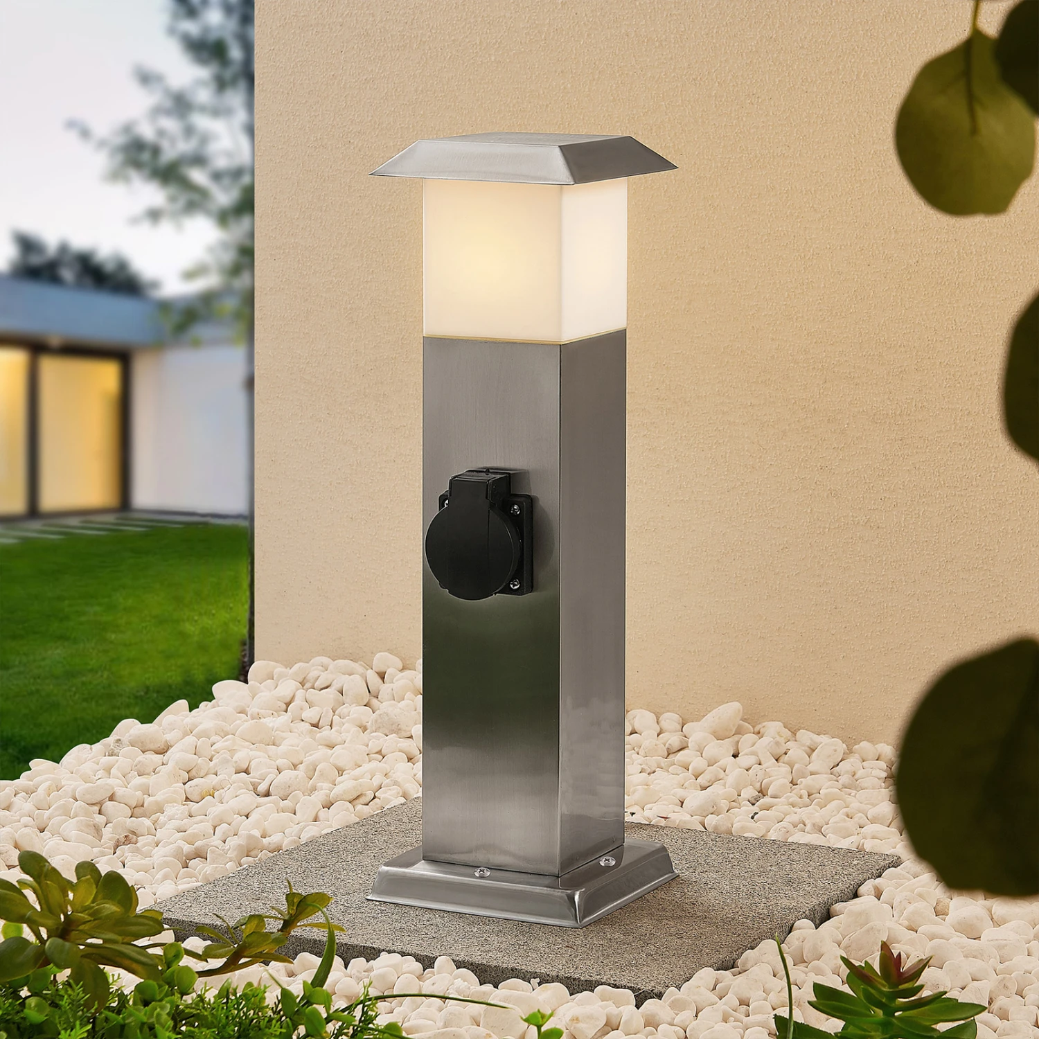 Riksa macht im Außenbereich mit dem Edelstahldesign immer eine gute Figur und überzeugt mit einem wertigen, stilvollen Erscheinungsbild. Die Sockelleuchte verfügt neben einer Lampenfassung hinter weißem Kunststoff auch über zwei Steckdosen, die seitlich angebracht und mit einer schützenden Klappe versehen sind. Dank der höheren Schutzart ist der Einsatz im Außenbereich bedenkenlos möglich, so dass die Sockellampe Riksa rund um Terrasse, Hof oder Garten nicht nur zuverlässig Licht spendet, sondern stets auch zwei Steckdosen bereithält, die für weitere Leuchten oder andere Gerätschaften, die Strom erfordern, genutzt werden können.
