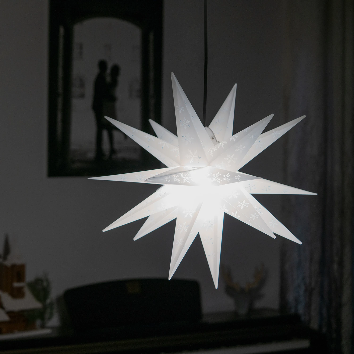 Dieser weiße Deko-Stern leuchtet nicht nur hell in die Nacht hinein. Er weist auch ein faszinierendes Muster aus aufgedruckten Schneeflocken auf, das gemeinsam mit der dekorativen Form des 18-zackigen Sterns aus dem Stern eine sehr auffällige Außendekoration macht.