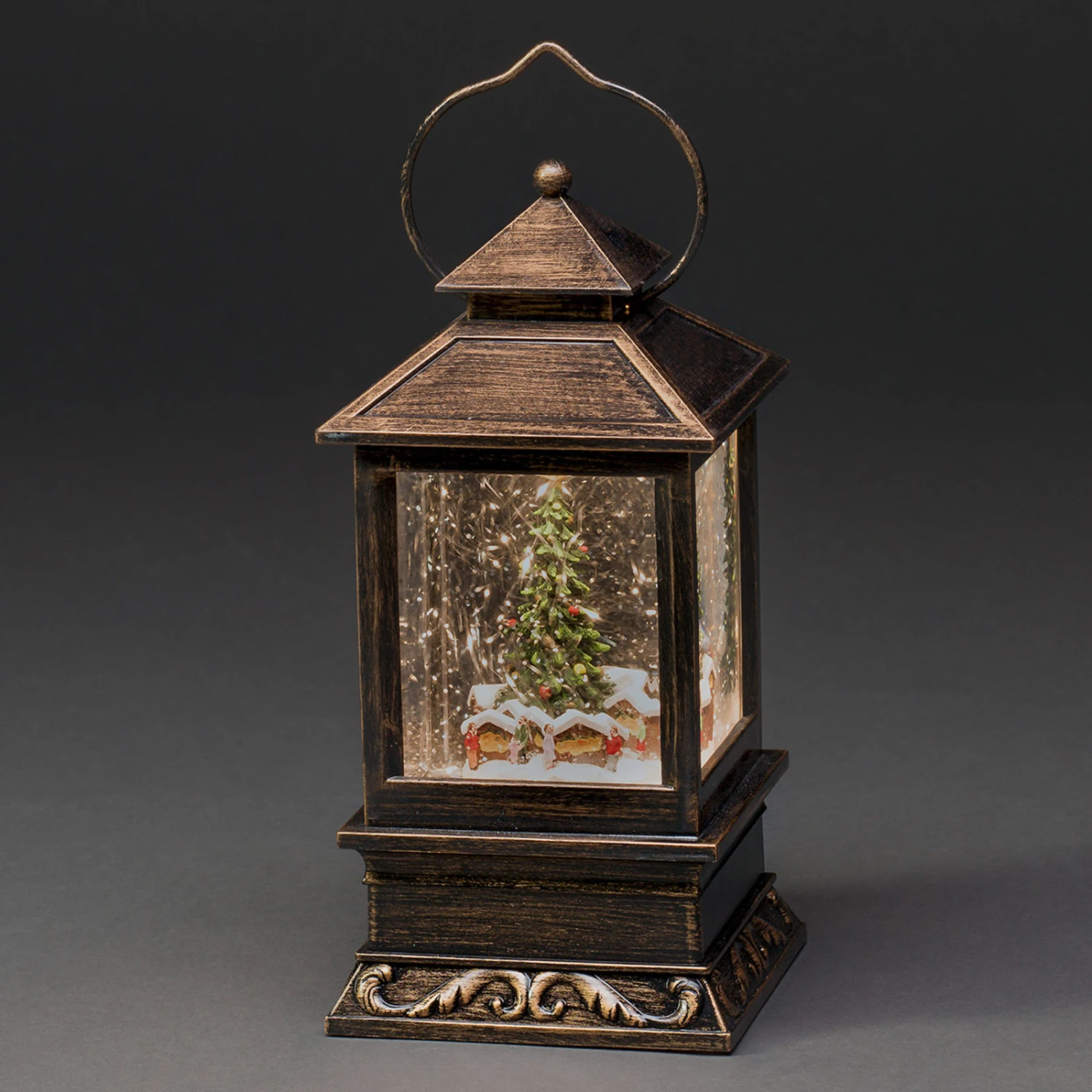 Dem Prinzip einer Schneekugel gleich, ist die LED-Schneelaterne mit Wasser gefüllt. Warmweißes LED-Licht bescheint die eingebauten Markthäuschen und bringt die herabrieselnden Schneepartikel zum Funkeln.