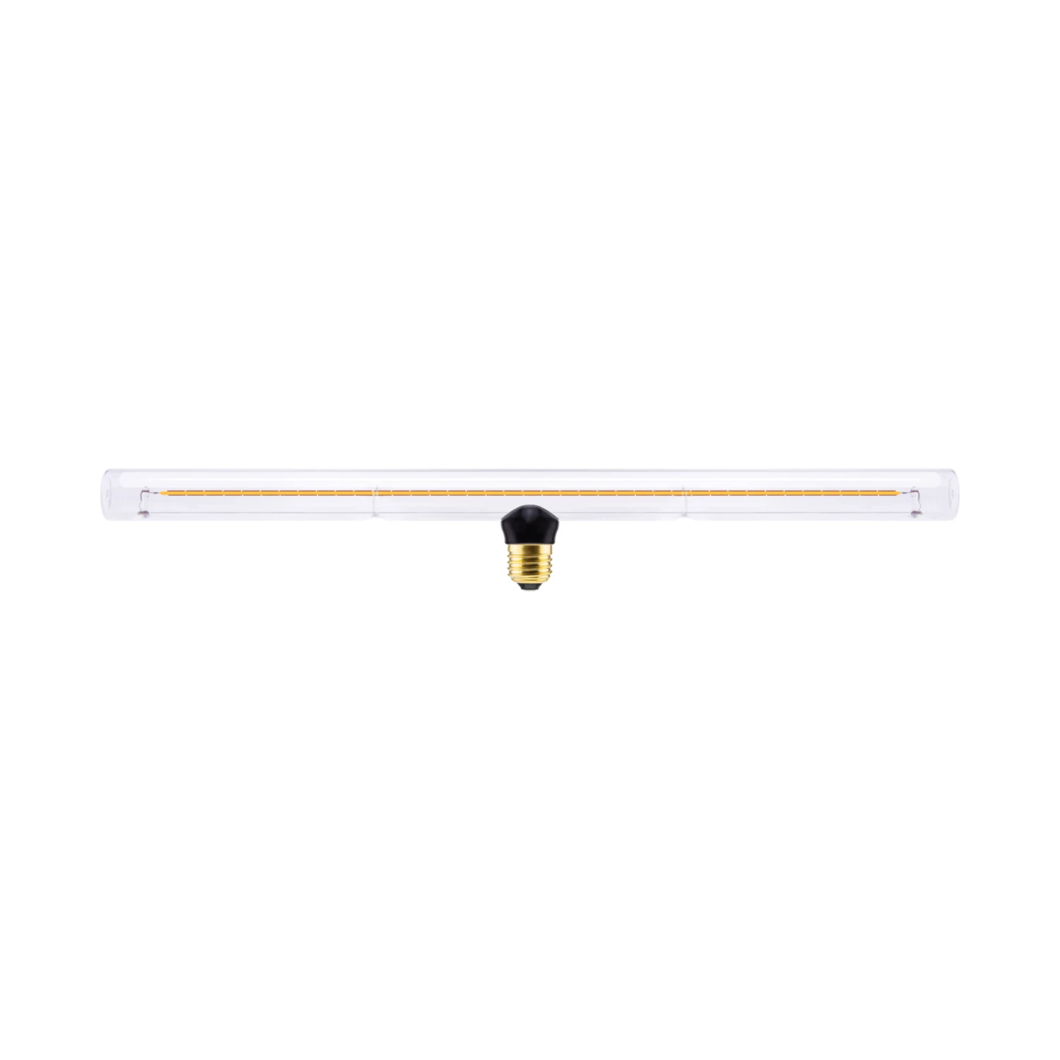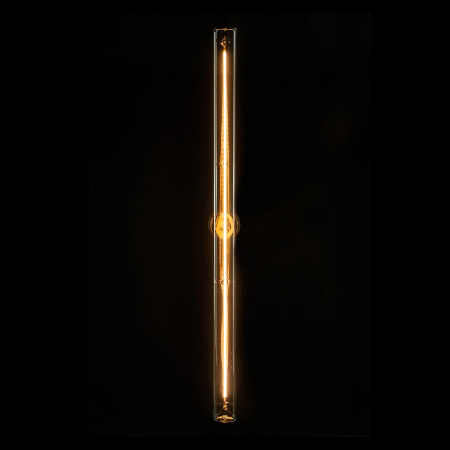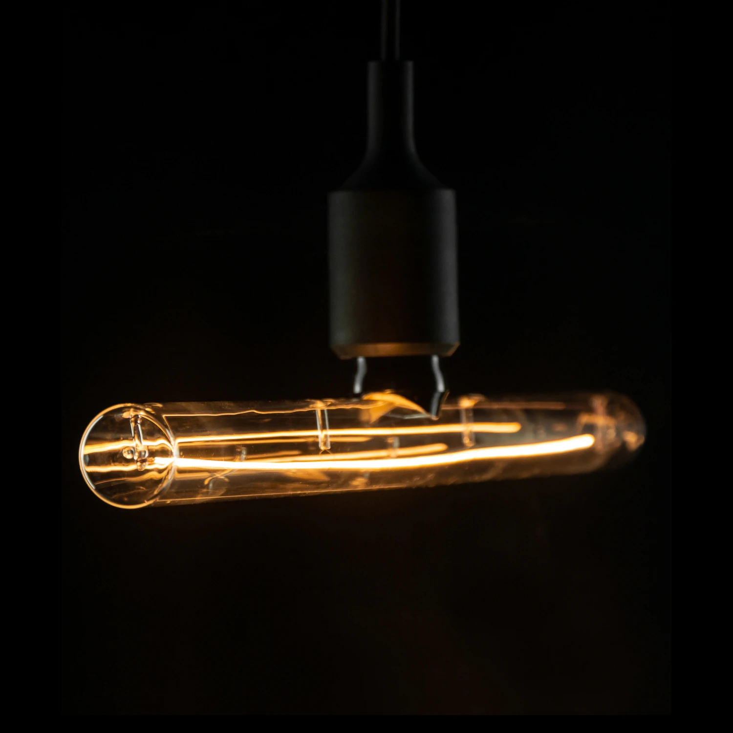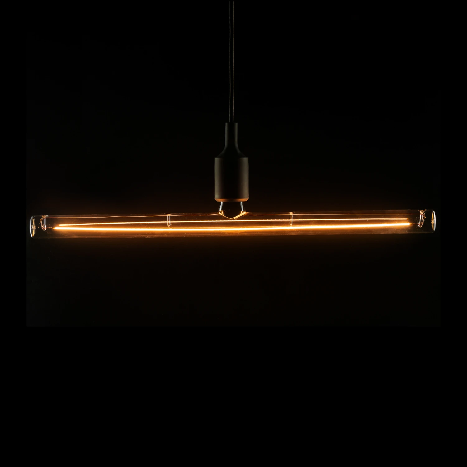 Diese LED-Lampe ist im Stil der Linienlampen gemacht, jedoch hier mit einem E27-Sockel ausgestattet, so dass sie in viele schirmlose Leuchten mit dieser Fassung eingesetzt werden kann. Die Lampe ist an ihrem Gewinde um 90° drehbar, so dass sie in eine beliebige Stellung gebracht werden kann. Modernste und energieeffiziente LED-Filamenttechnologie lässt die Linienlampe in besonders warmer Lichtfarbe in einem sehr behaglichen Licht erstrahlen, das sich mit vielen gängigen Dimmern auch dimmen lässt.