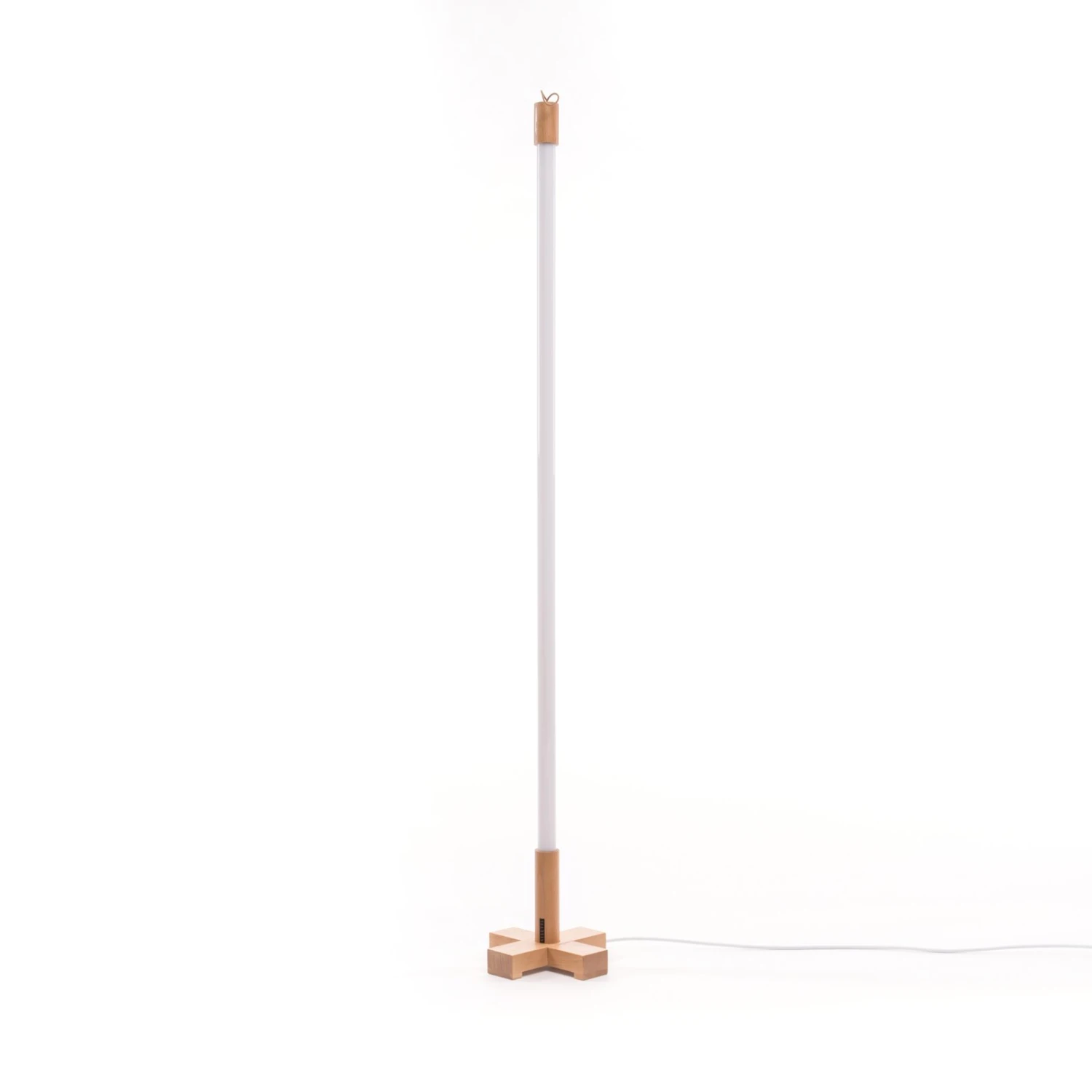 Röhrenförmige LED-Stehleuchte Linea mit getöntem Glas und Enden aus hellem Holz