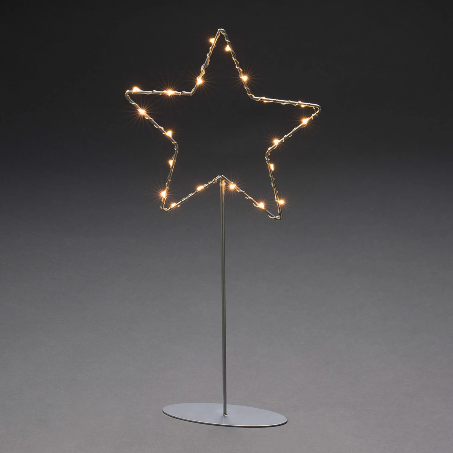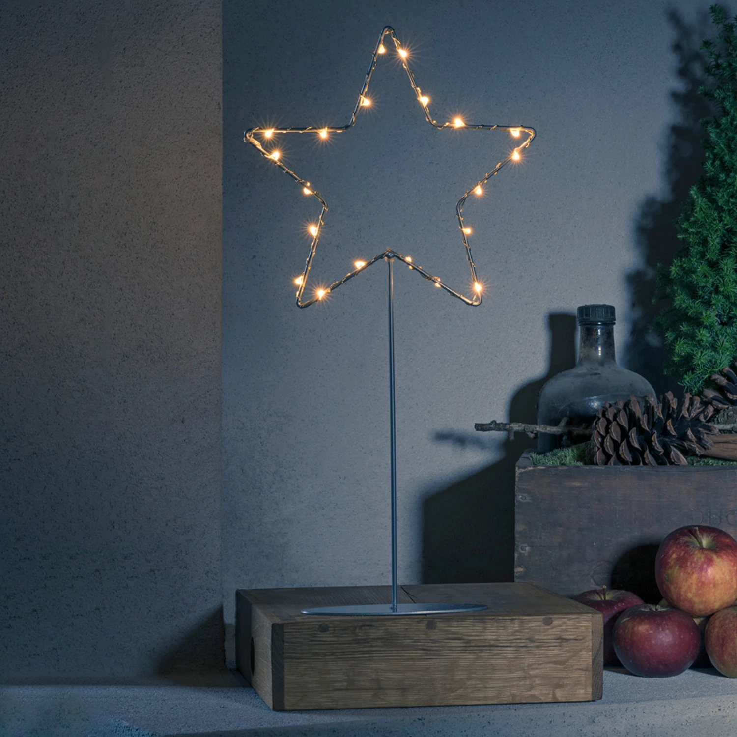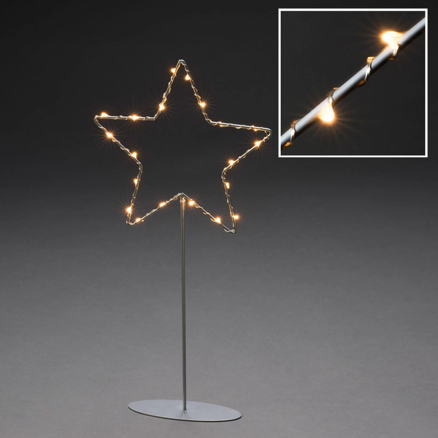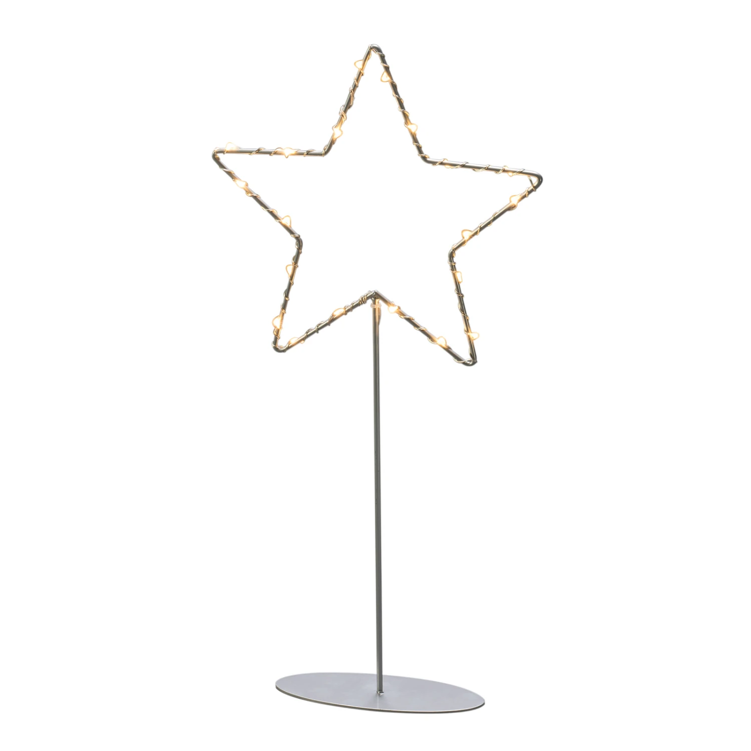 Die Silhouette der Dekoleuchte Metallstern ist mit silberfarbenem Draht umwickelt und mit LEDs besetzt, die in einem warmen Bernsteinton leuchten. Dies bewirkt in der Umgebung einen sanften Lichtschein, der die Advents- und Weihnachtszeit erst so richtig gemütlich macht.