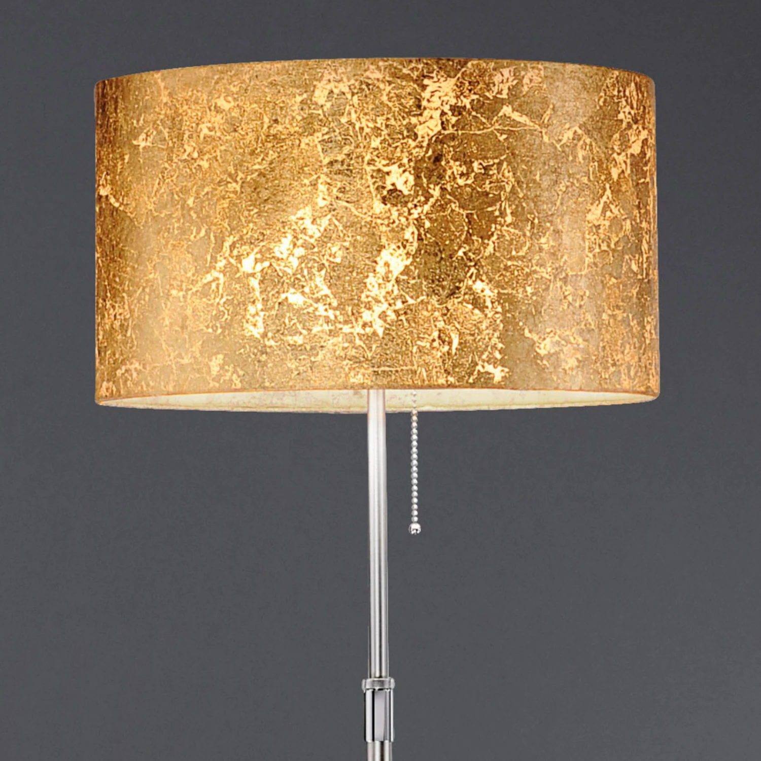 Die Stehleuchte Alea Loop ist ein herrlicher Blickfang mit ihrem goldenen Leuchtenschirm. Durch ihre praktische Höhenverstellbarkeit hat sie eine Höhe von 115 cm bis 160 cm. Die Außenseiten des runden Schirms sind mit edlem Blattgold belegt. Dadurch entsteht ein filigranes Lichtspiel mit prächtigen Glanzeffekten. Drei E27-Leuchtmittel liegen im Inneren. Oben im Leuchtenschirm befindet sich ein Diffusor aus Acrylglas, der Blendungen verhindert. Die Beleuchtungsatmosphäre wird von einem warmtönigen Licht geprägt. Die Stehleuchte selbst wertet mit ihrem Goldschirm das gesamte Ambiente auf. Sie entfaltet ihre ganze Wirkung in einem eleganten Umfeld mit einem Hauch von Purismus – beispielweise in Kombination mit weißen Ledermöbeln und spartanischem Dekor. Hier setzt Alea Loop einen fantastischen Effekt und erhöht die Feinheit puristischen Stilbewusstseins. Sie eignet sich aber ebenso als edle Zusatzleuchte in vielen anderen Einrichtungsstilen. Deutsche Qualitätsleuchte. Über den Zugschalter lassen sich die drei Lichtquellen getrennt voneinander schalten (1, 2 oder alle 3).