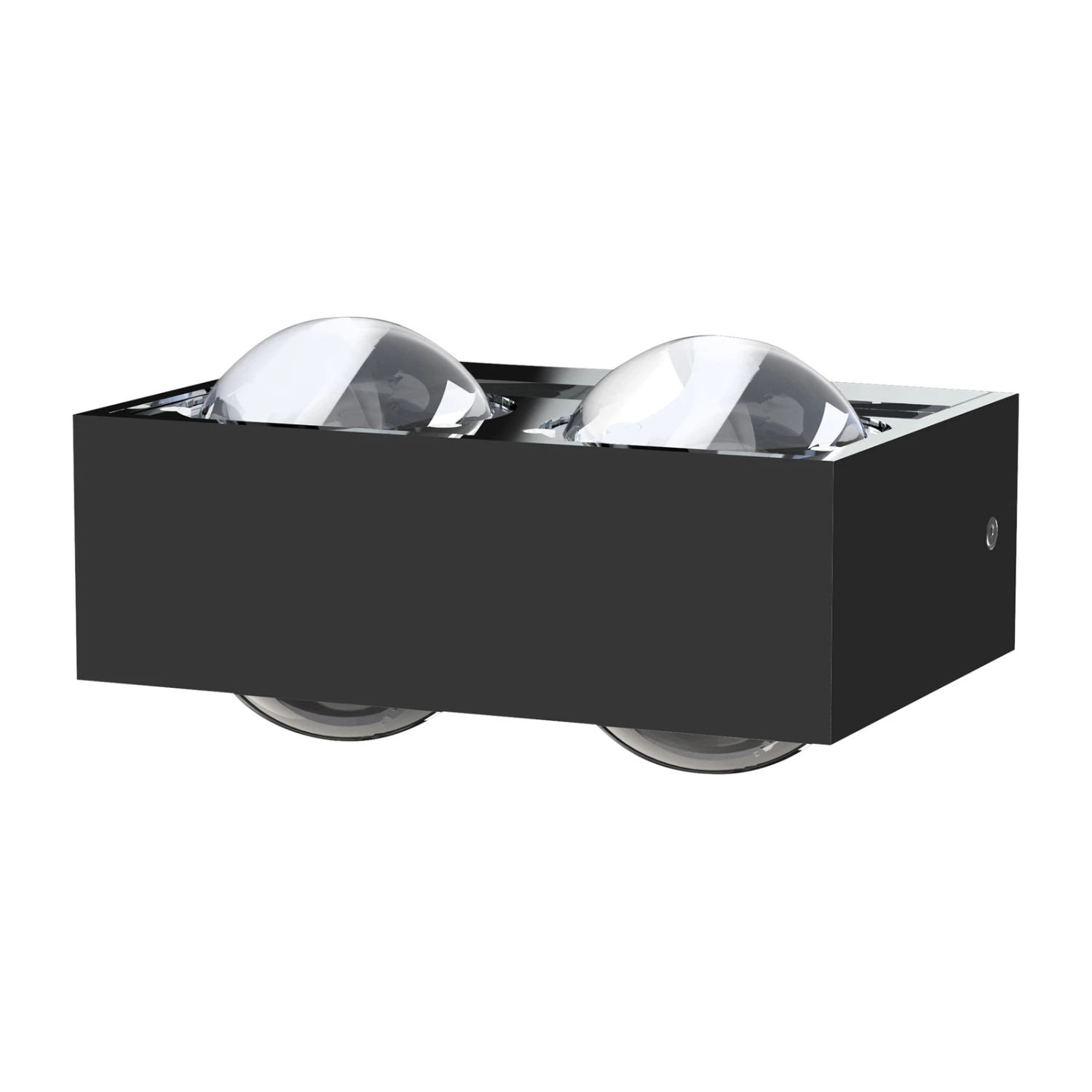 Mit insgesamt vier klaren Linsen aus Glas ausgestattet, überzeugt die Wandleuchte Focus 150 mit ihrer akzentuierten Lichtwirkung. Oben und unten sitzen jeweils zwei dieser Linsen nebeneinander. Durch die klare Beschaffenheit werden scharfkantige Lichtkegel an die Wand projiziert, die ein stimmungsvolles Lichtbild ergeben. Der Korpus aus Metall ist markant und eckig geformt, auf Details wurde verzichtet, wodurch Focus 150 mit eleganter Zeitlosigkeit überzeugt. Sie eignet sich ideal, um Wohn- oder Flurbereiche gekonnt in Szene zu setzen und diese umfangreich zu beleuchten. Die Wandlampe von Top Light wird mit zwei G9-Leuchtmitteln bestückt.