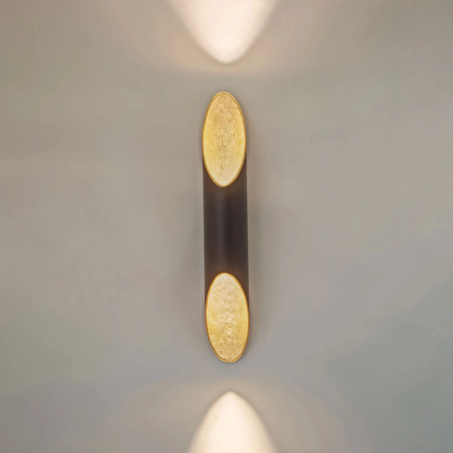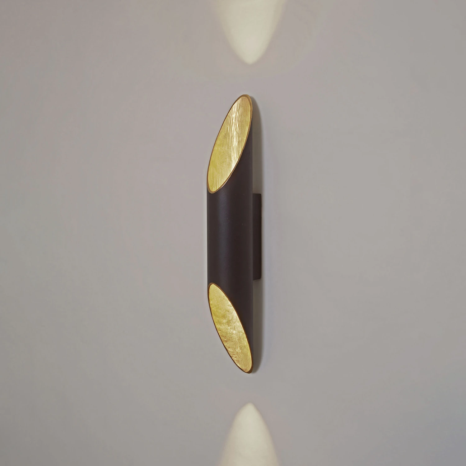 Eine anthrazitfarbene Eisenröhre, die an beiden Enden abgeschrägt ist und so den Blick auf die goldfarbene Innenseite mit gehämmerter Struktur frei gibt, stellt die Wandleuchte Organo dar, die wahlweise horizontal oder vertikal befestigt werden kann. Das abstrahlende Licht erhält durch den Goldton einen warmen Schimmer. Eine stilvoll gearbeitete Zusatzlichtquelle mit faszinierender Lichtwirkung. Farblich mit vielen Wohnstilen kombinierbar.