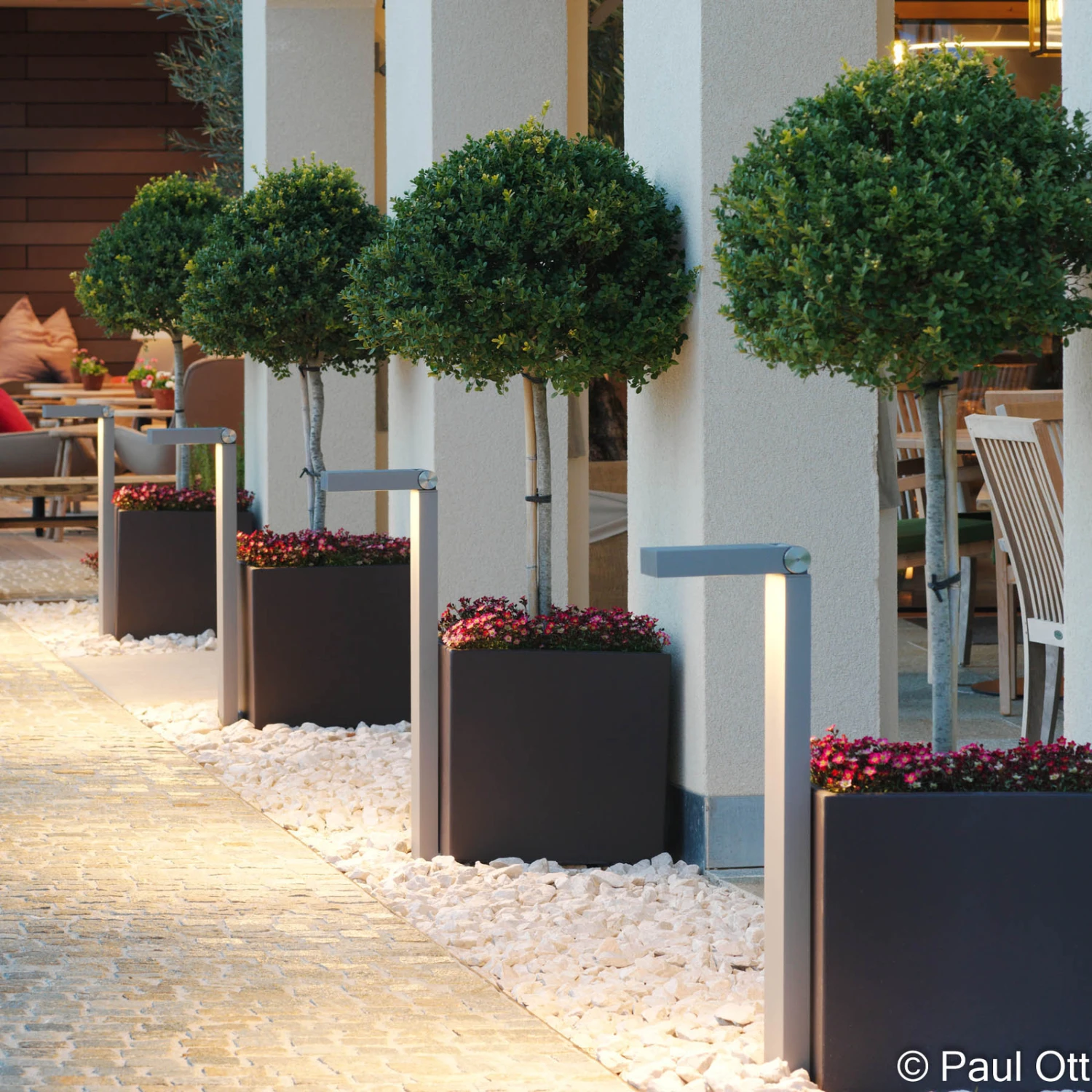 Die aus schutzeloxiertem und dunkelgrau pulverbeschichtetem Aluminium gefertigte LED-Wegeleuchte Streamcut eignet sich mit ihrer reduzierten, rechteckigen Gestaltung ideal für modern konzipierte Außenanlagen. Der Kopf lässt sich um +/- 90° vertikal schwenken (je 30° arretierbar), um das Licht je nach Bedarf nach vorne oder nach unten zu richten. Hinter einer Abdeckung aus Sicherheitsglas sind warmweiß strahlende LEDs verbaut, deren Licht durch eine hochwertige Linsentechnik asymmetrisch verteilt wird.