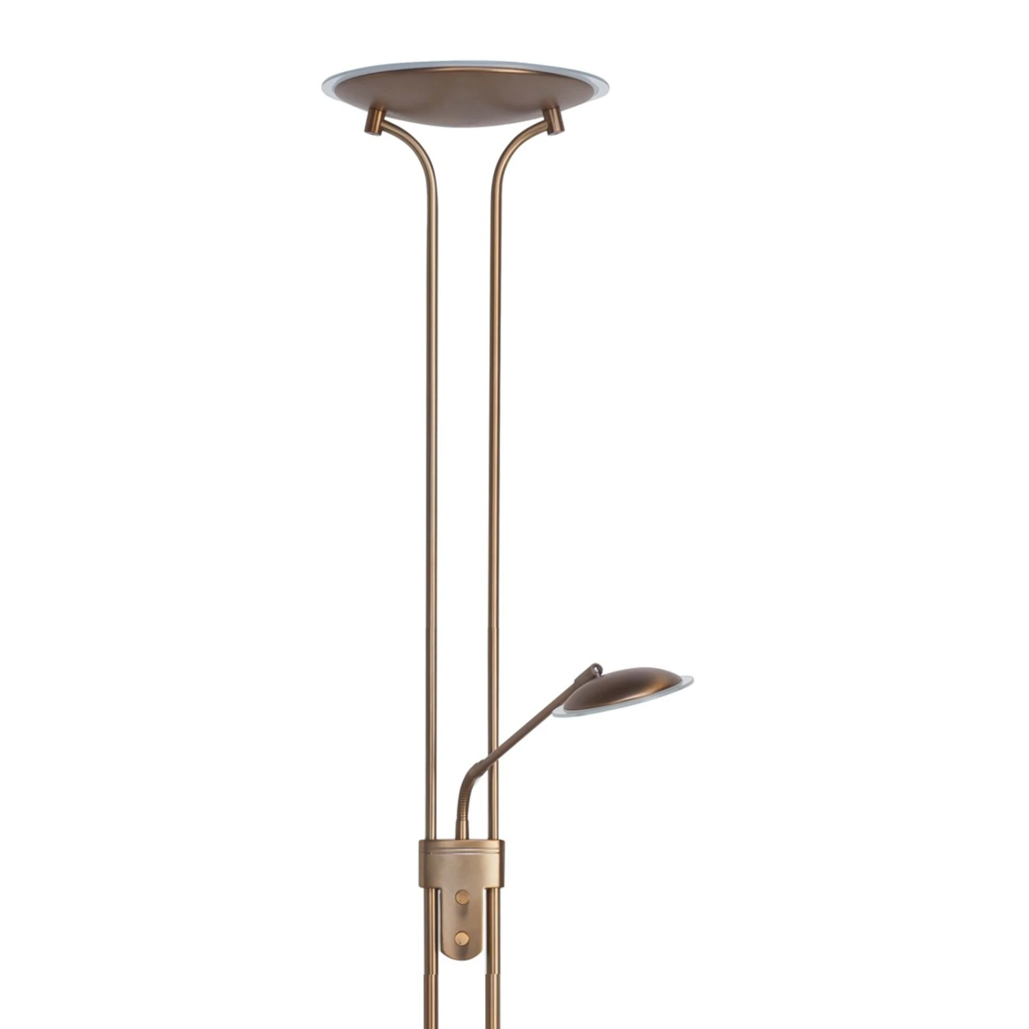 Sehr zierlich wirkt der LED-Deckenfluter Lunera trotz seiner Höhe von 180 cm durch seine Gestaltung. Die flache Fluterschale mit oberer Glasabdeckung sitzt auf dem schlichten Gestell, etwa auf halber Höhe des Gestänges befindet sich der Arm mit der justierbaren Leselampe. Auch diese ist zur Vermeidung von Blendungen mit einer satinierten Abdeckung versehen. Zwei Drehdimmer auf der gleichen Höhe machen es möglich, das Licht der LEDs im Fluter und derjenigen in der Leselampe unabhängig voneinander ein- und auszuschalten und auch zu dimmen.